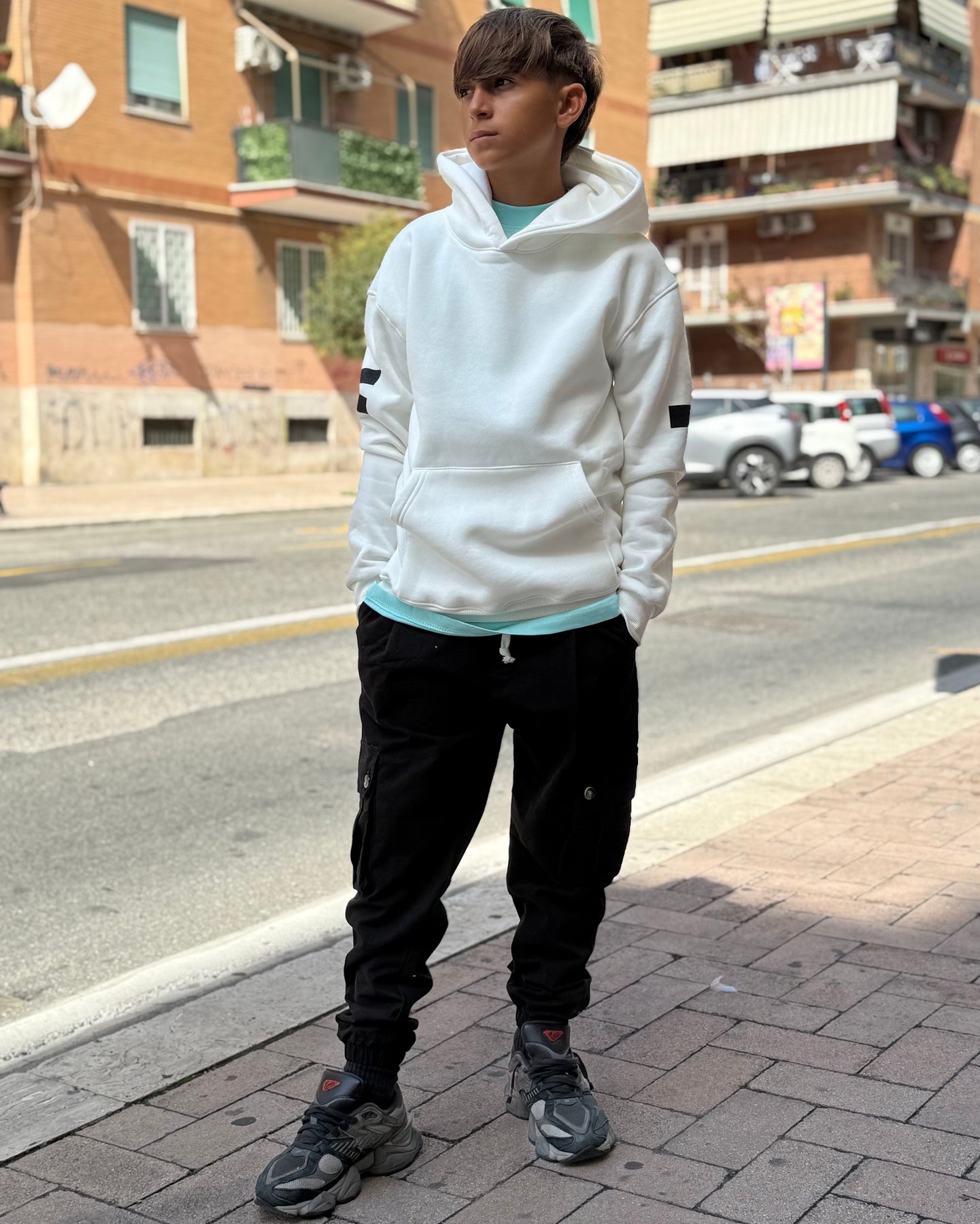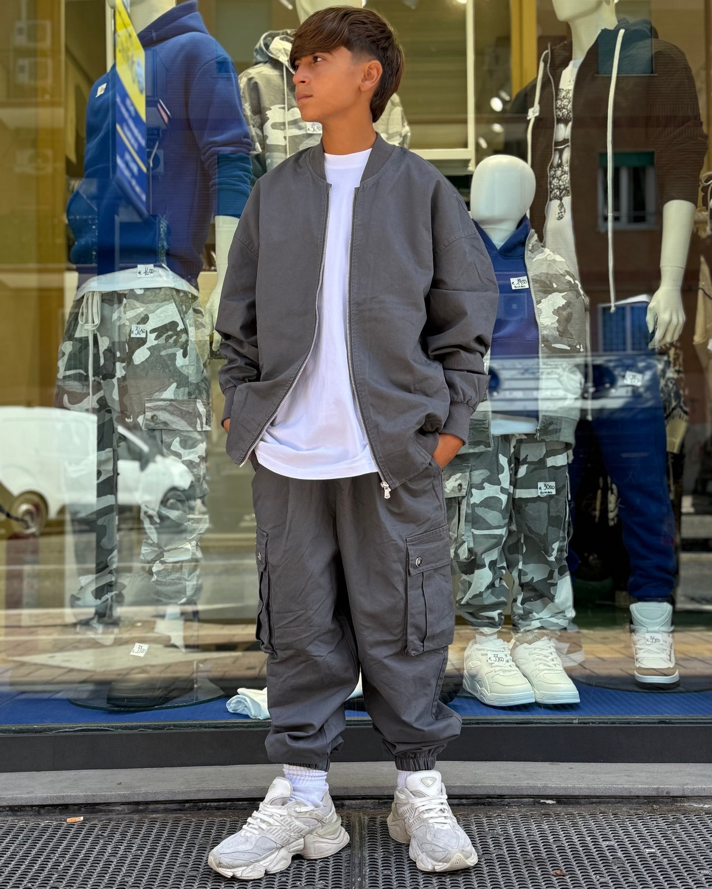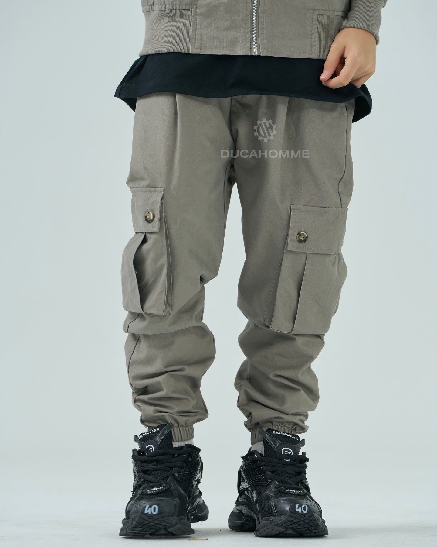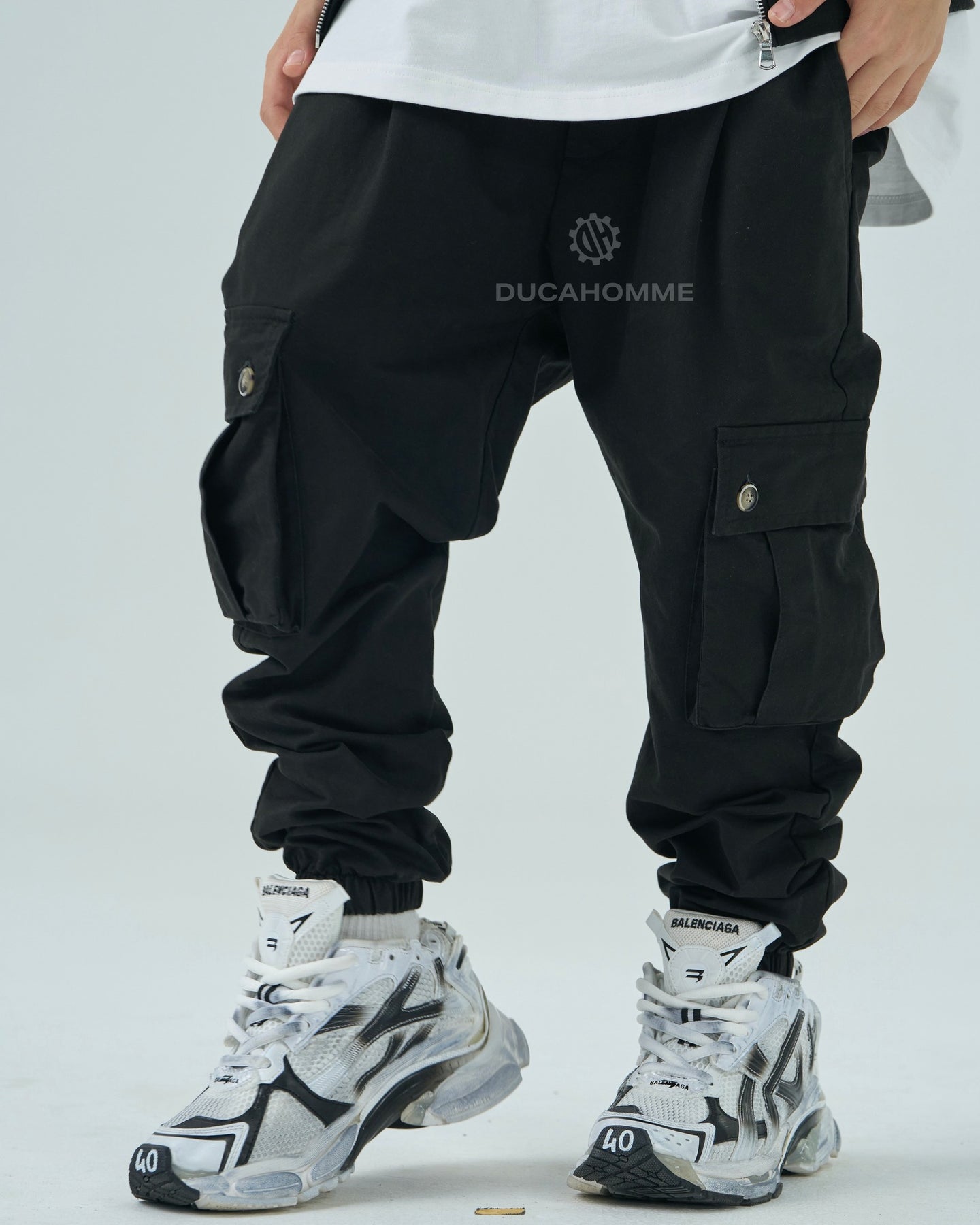 pantalone cargo in cotone tasconi laterali con chiusura bottoni elastico in vita con laccio cannolè orlo elastico "duca homme"
