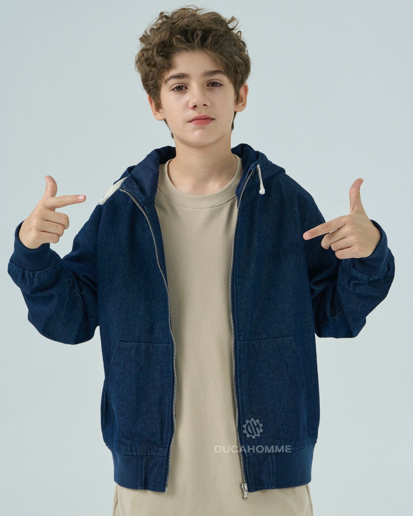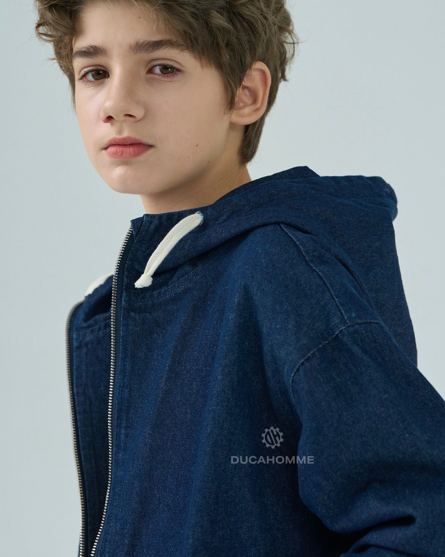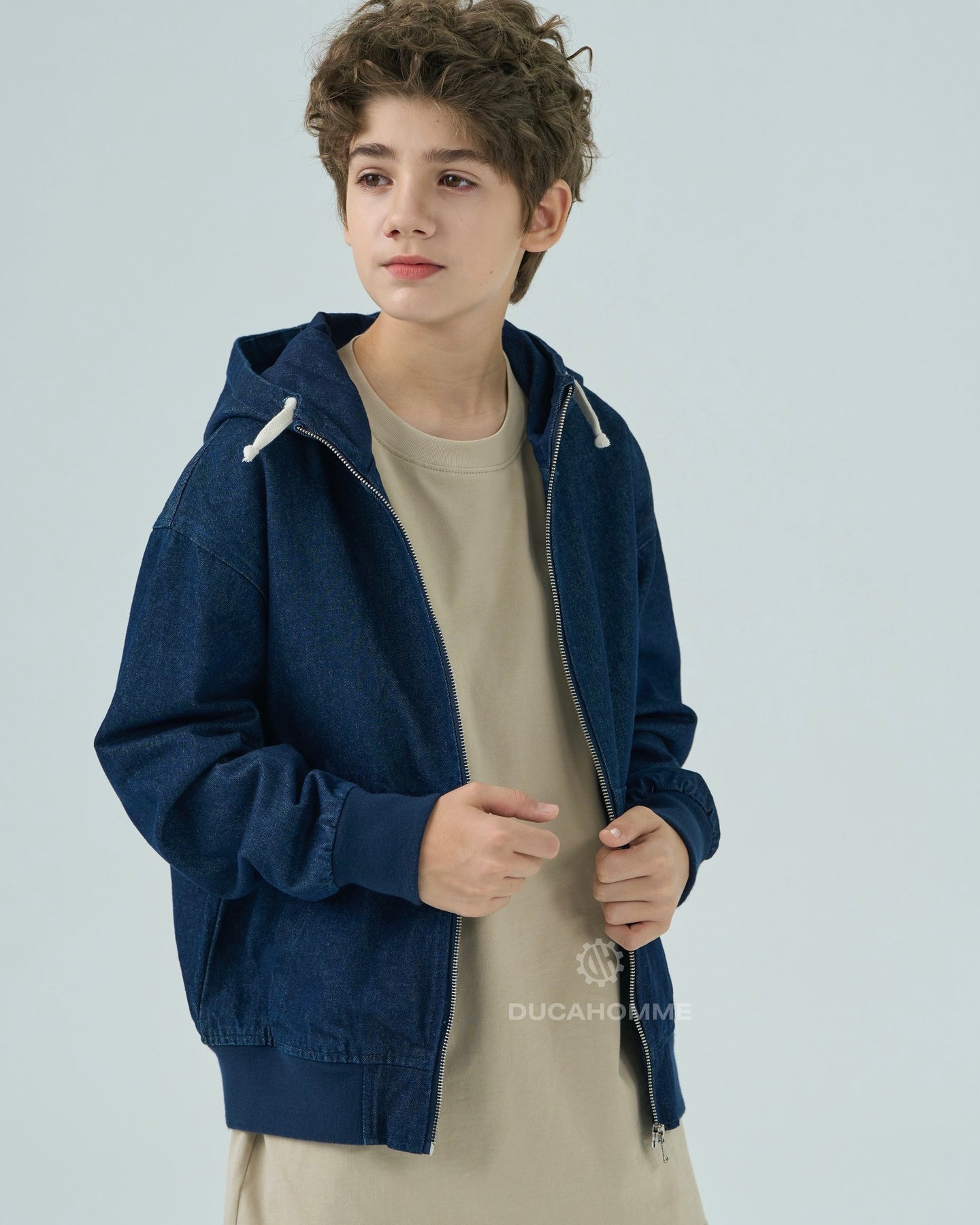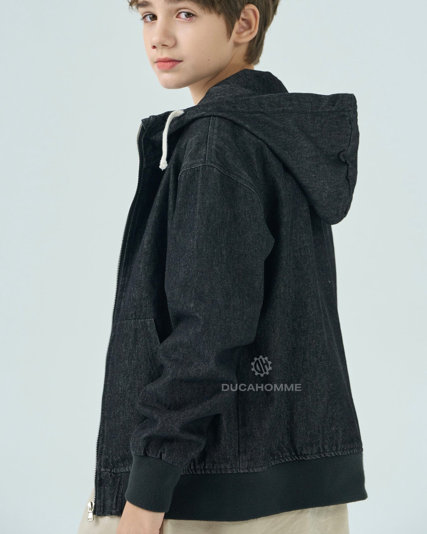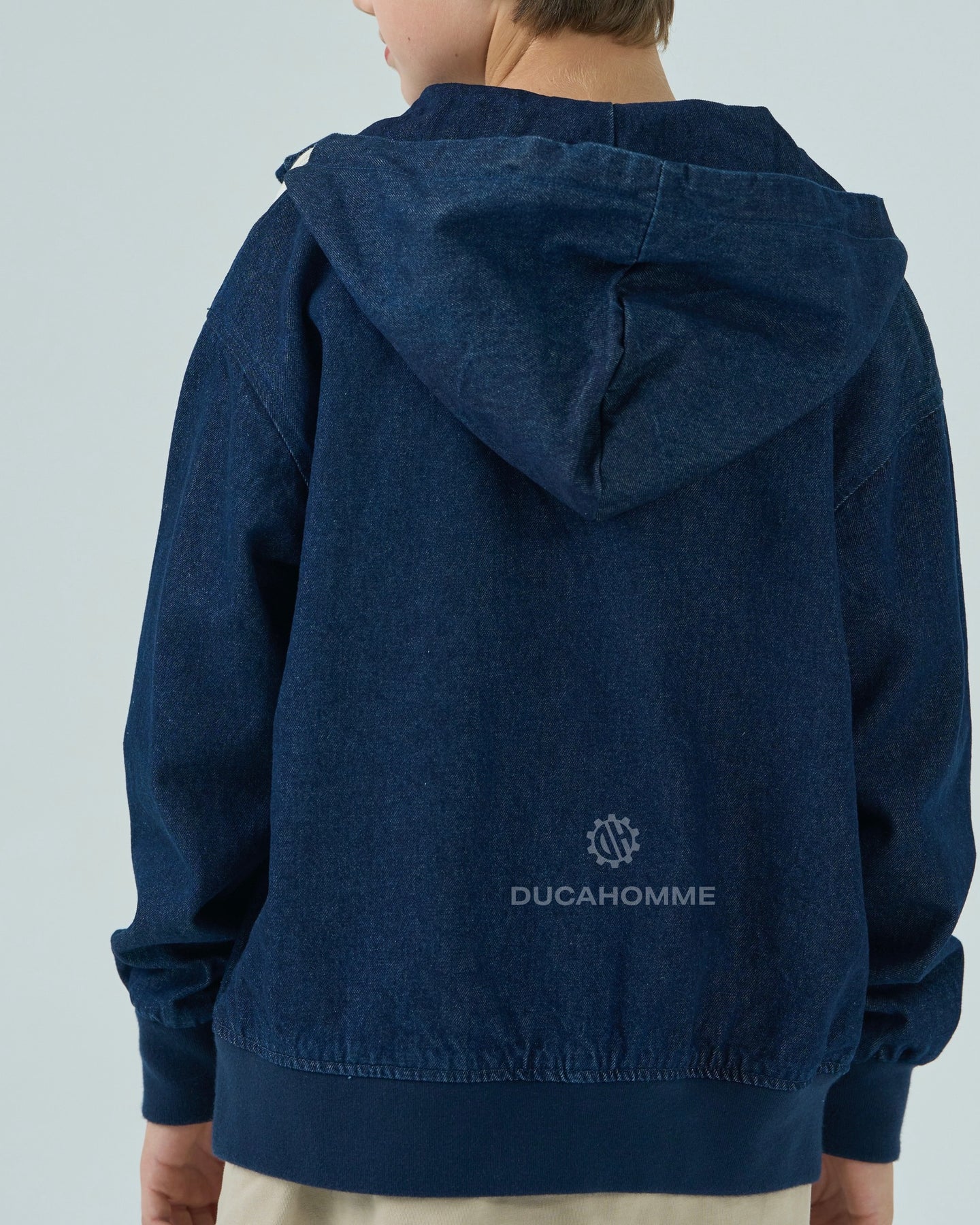 felpa in denim con cappuccio chiusura cerniera cannolè orlo e polsini "duca homme"