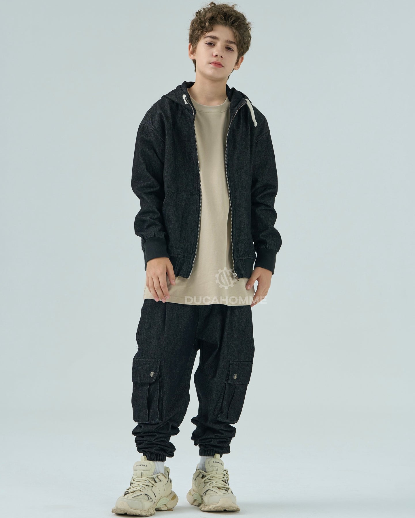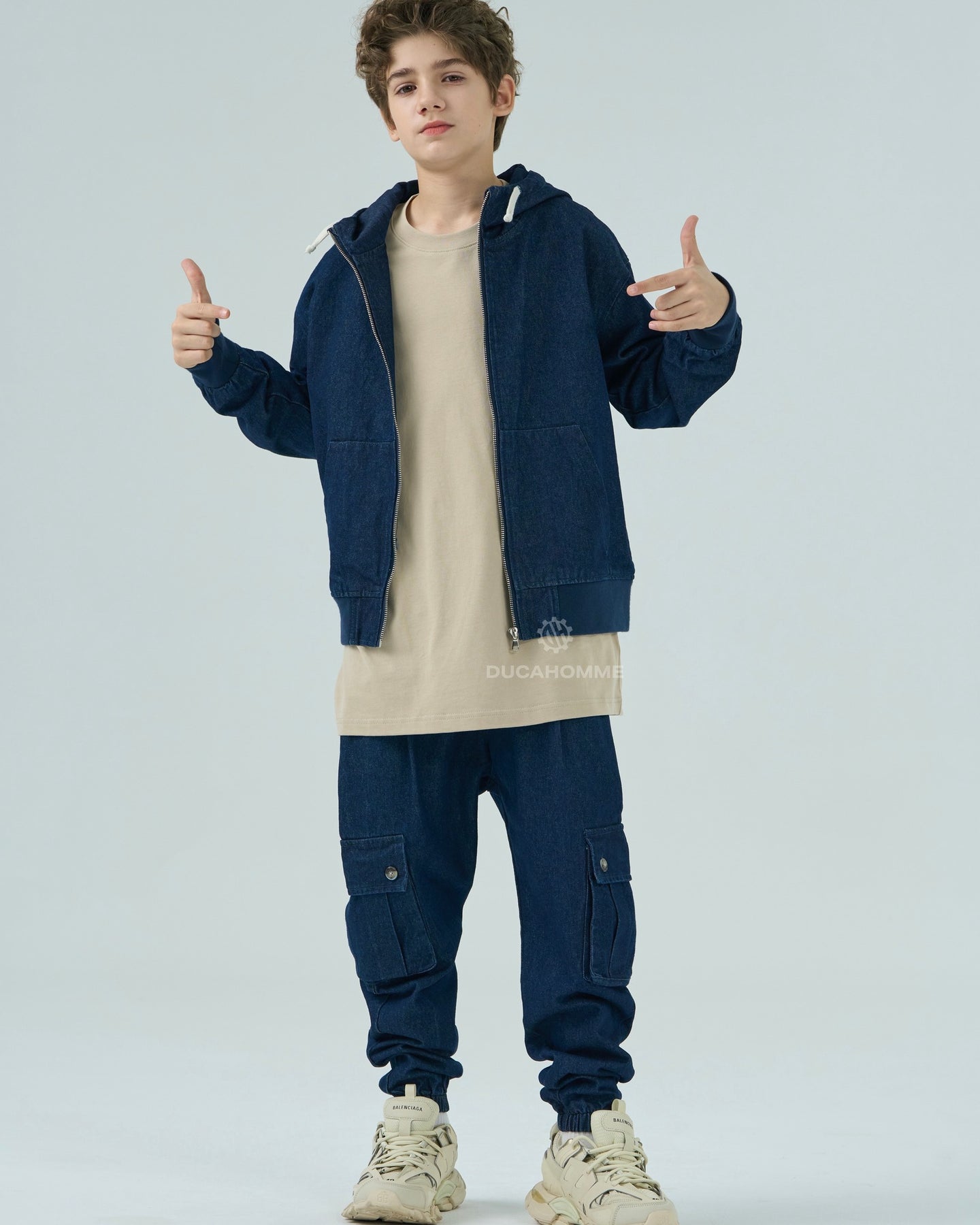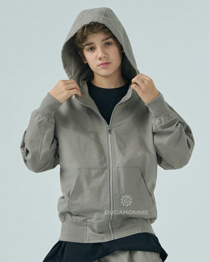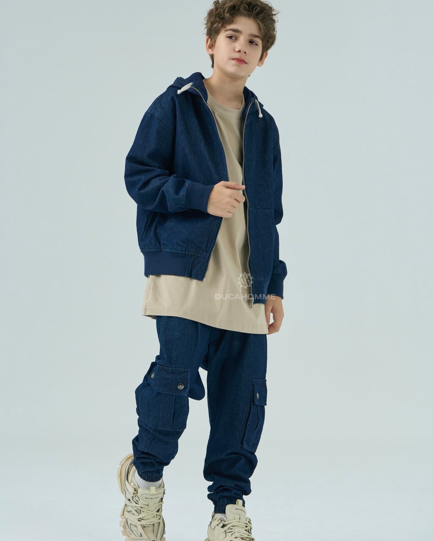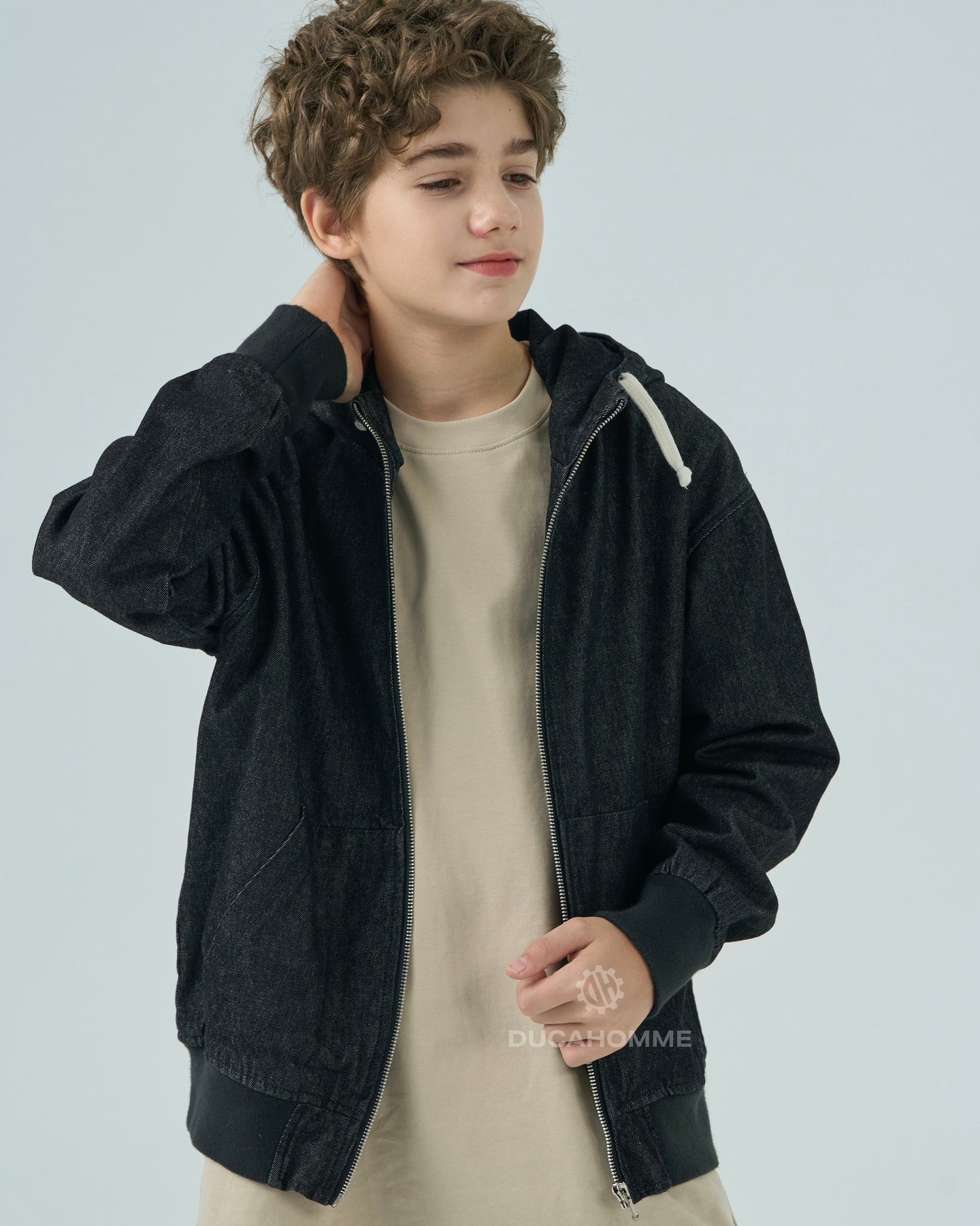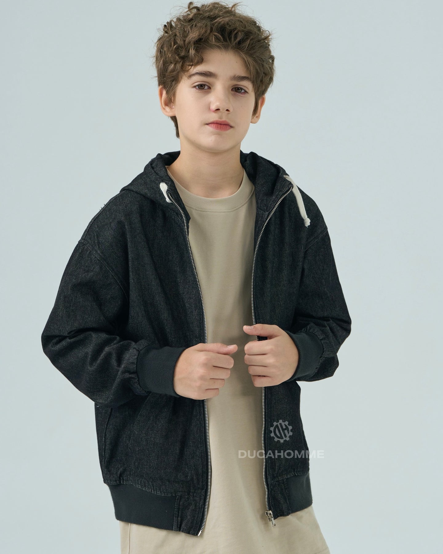 felpa in denim con cappuccio chiusura cerniera cannolè orlo e polsini "duca homme"