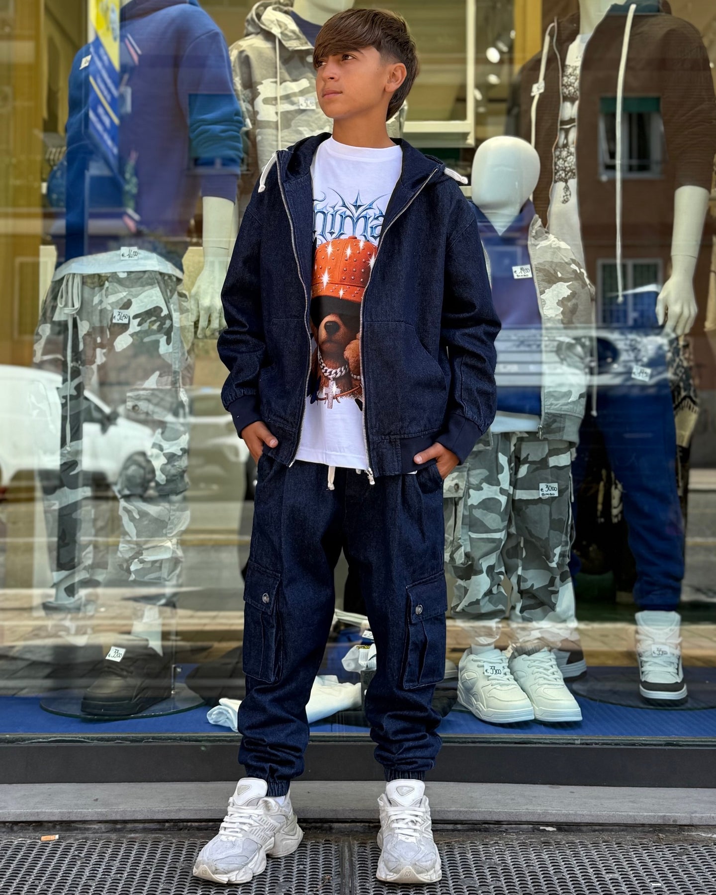 pantalone cargo in denim tasconi laterali con chiusura bottoni elastico in vita con laccio cannolè orlo elastico "duca homme"