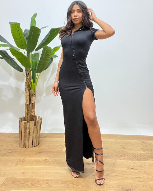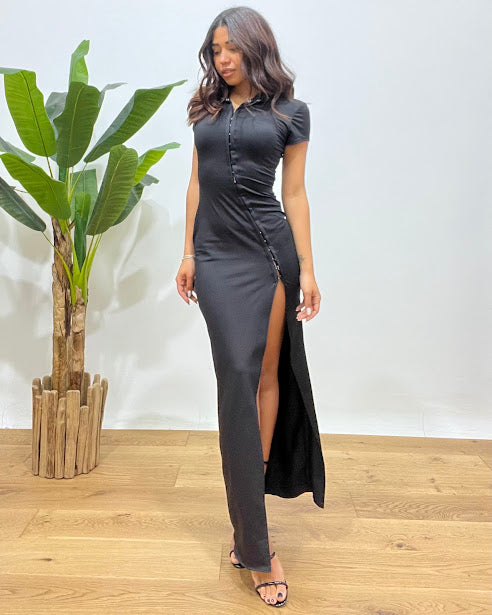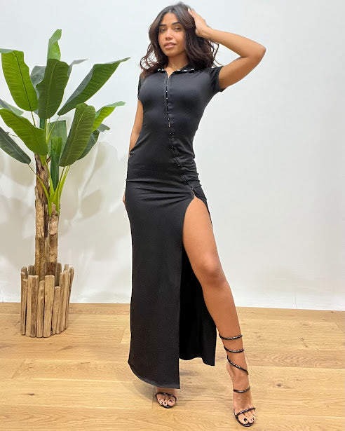 abito lungo dettaglio chiusura gancetti spacco laterale