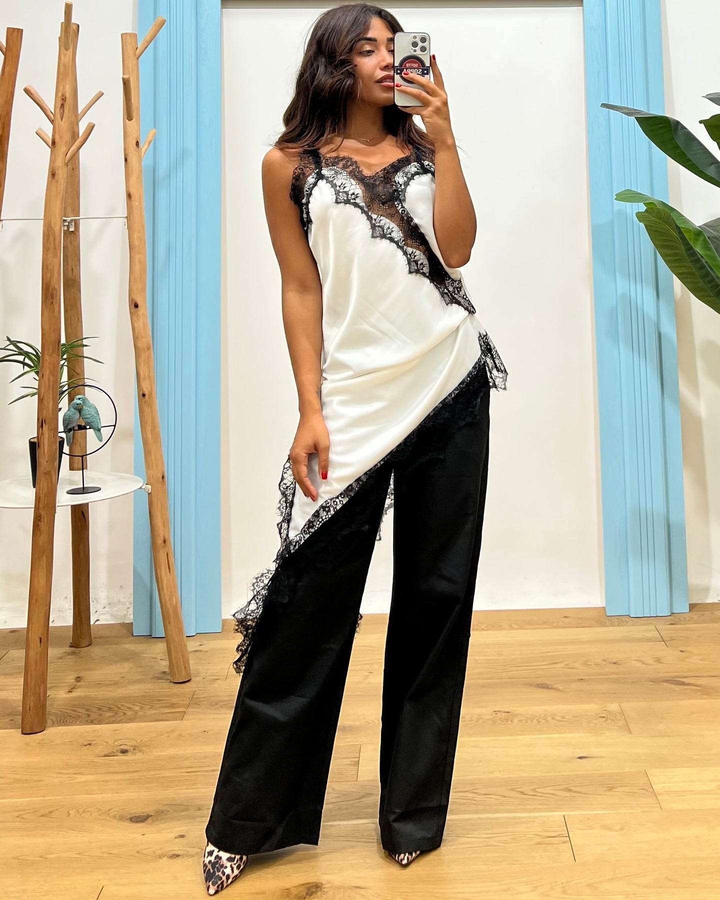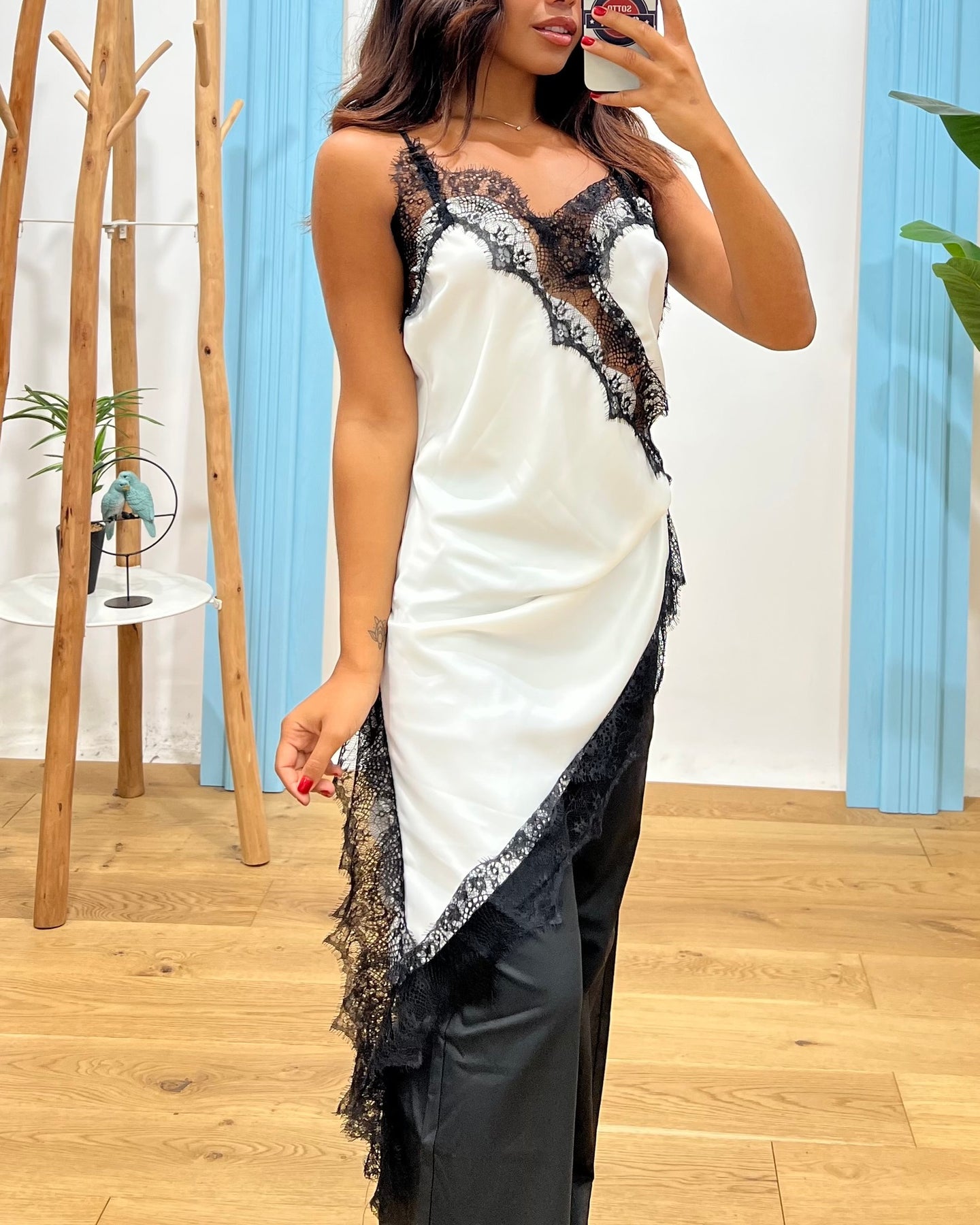 abito satinato scollo a v e spalline sottili dettaglio applicazione in pizzo fondo asimmetrico con spacco