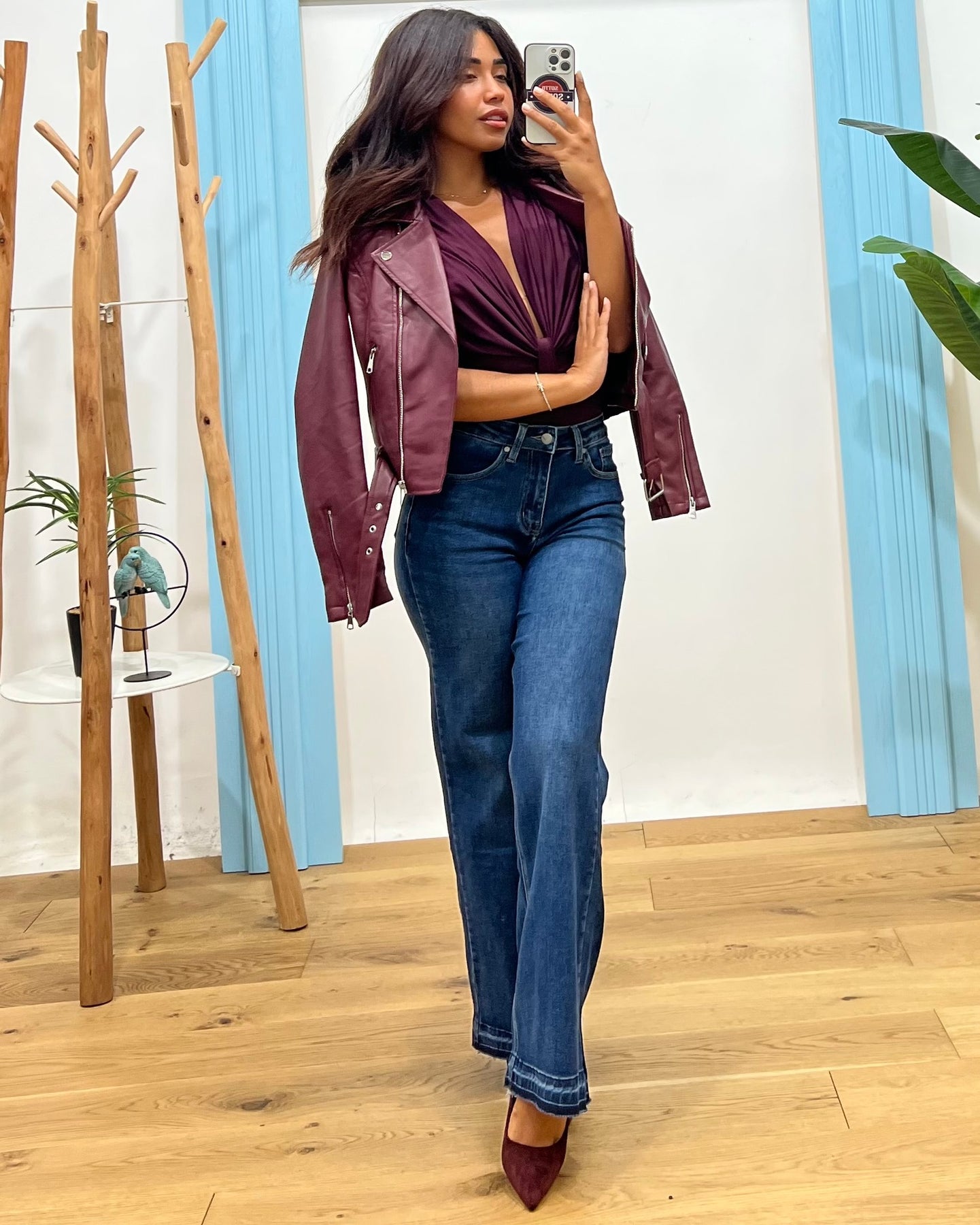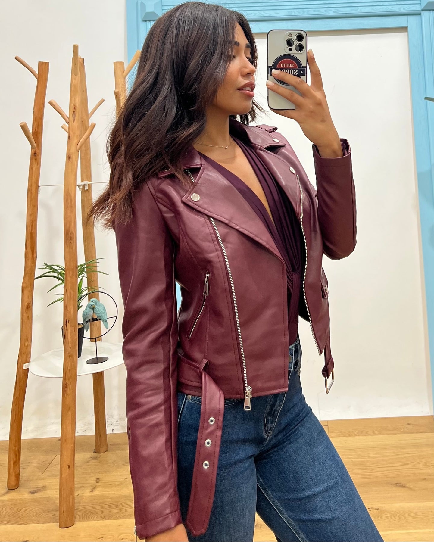 giubbino modello chiodo in ecopelle passanti in vita con cintura regolabile tasche zip anteriori