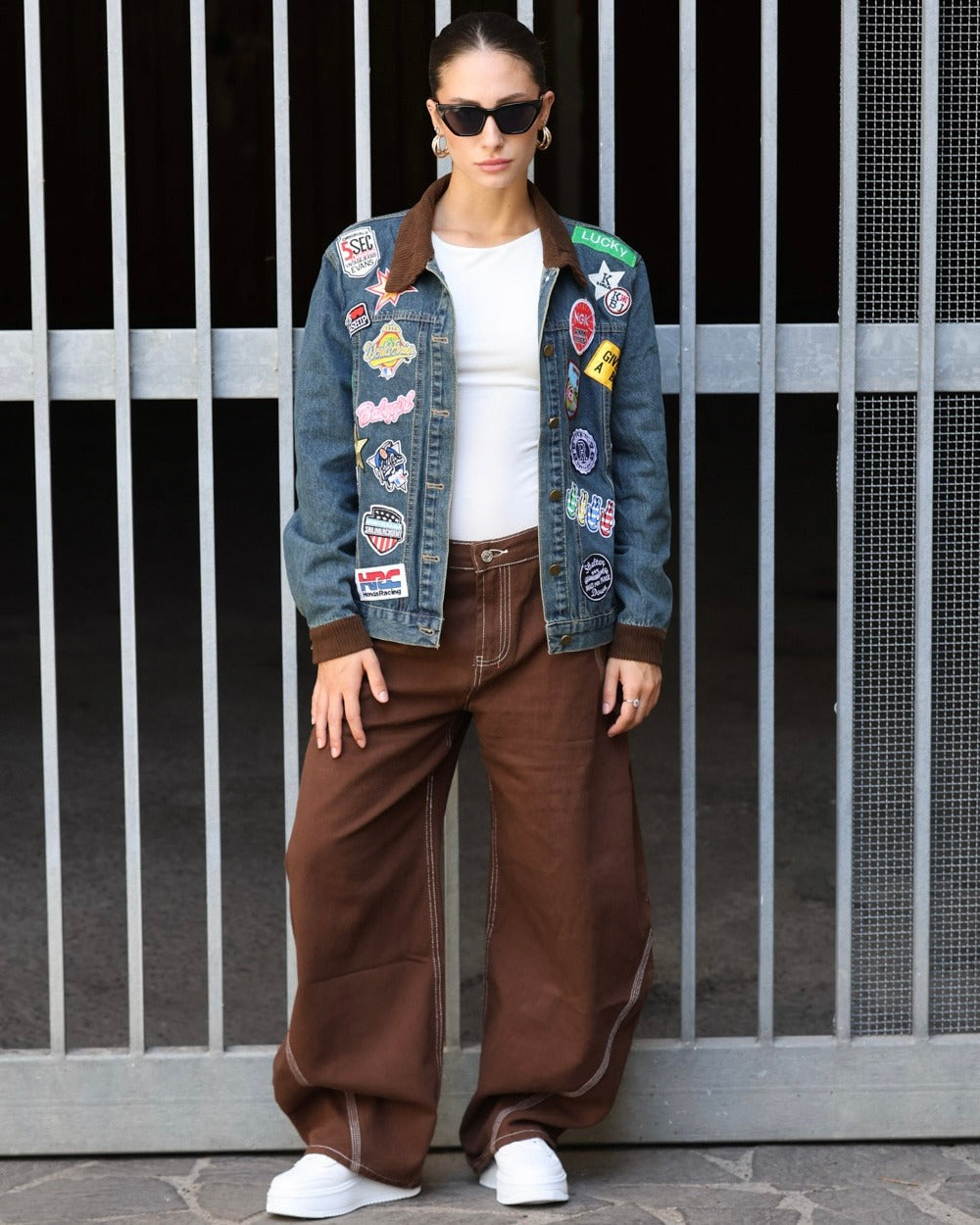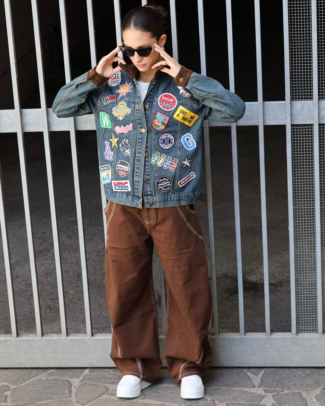 giubbino jeans con toppe colorate, dettaglio colletto scamosciato a coste