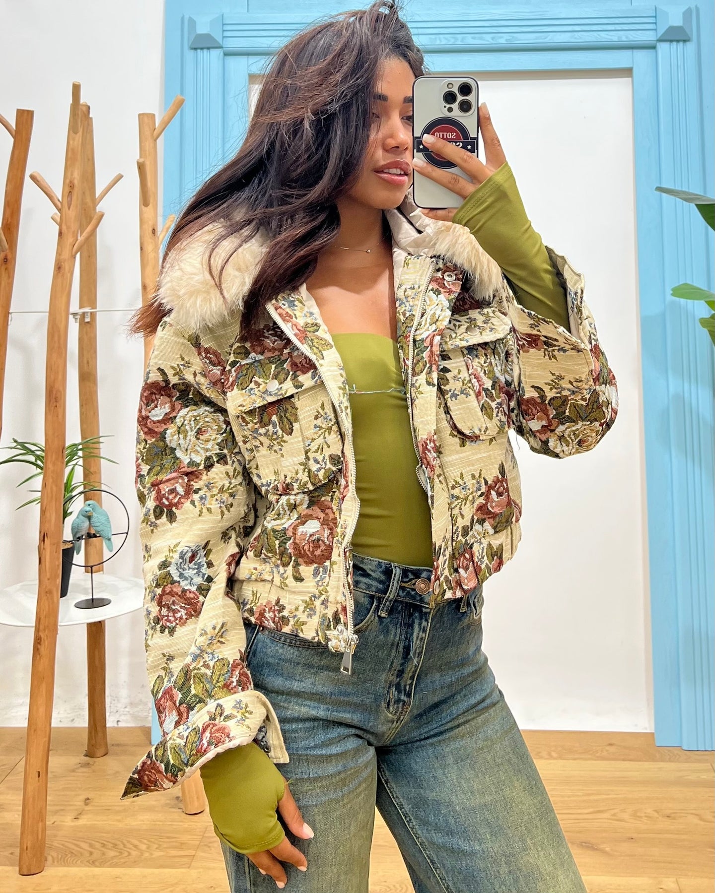 giubbino crop sfondo fantasia floreale dettaglio cappuccio con bordo pelliccia sintetica removibile