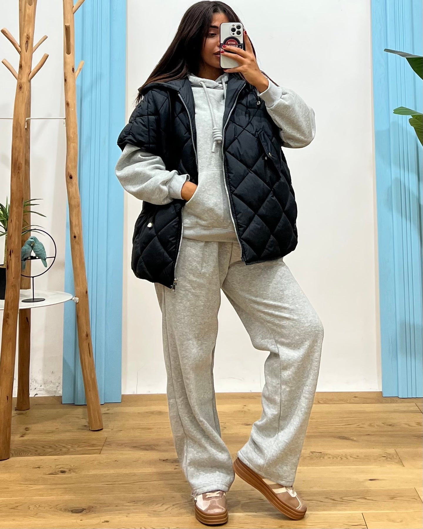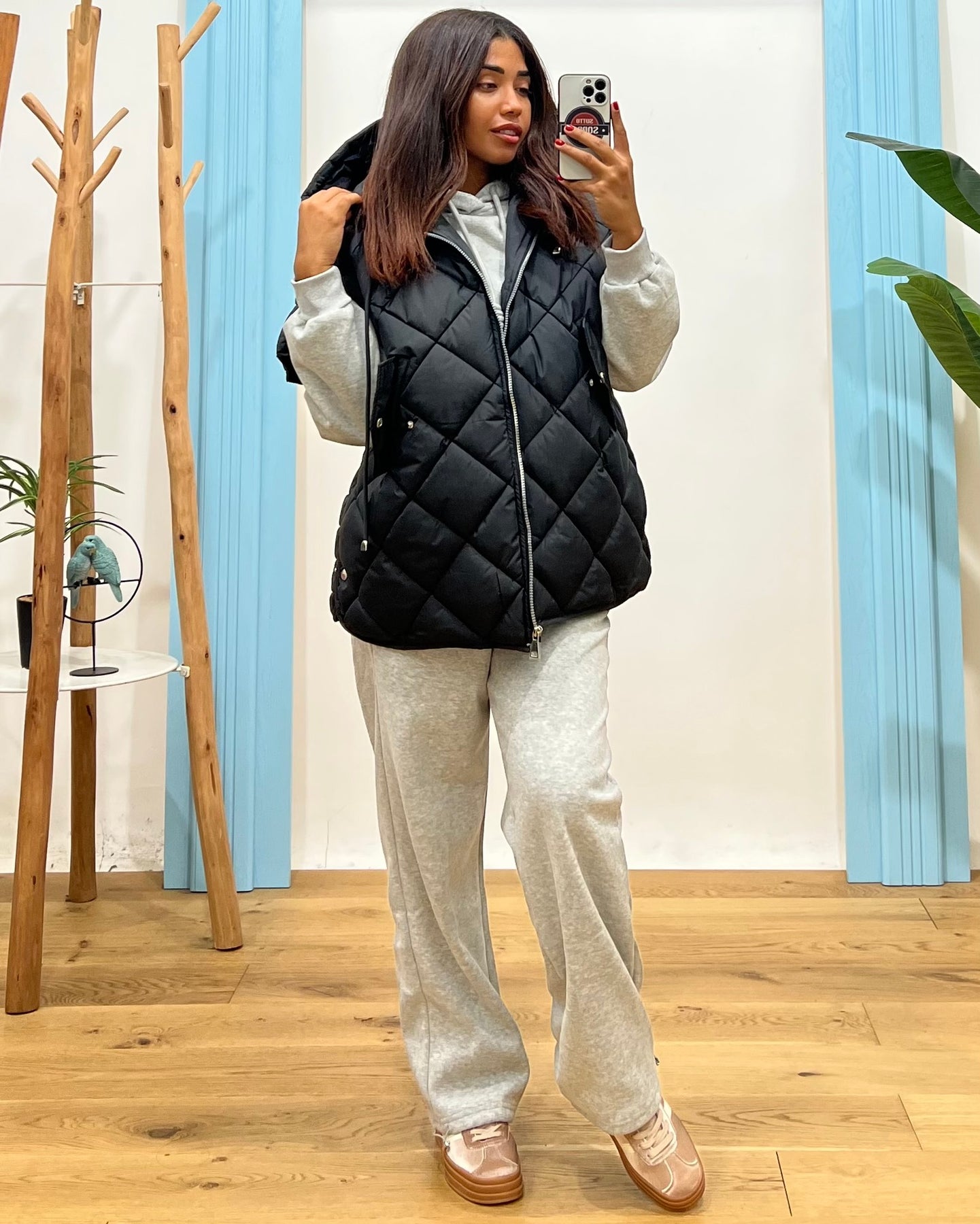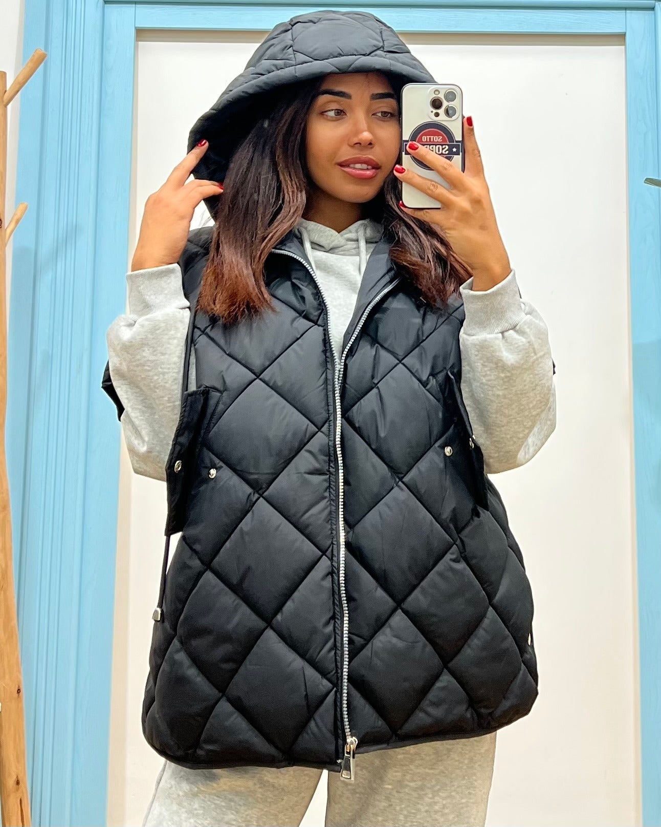smanicato piumino over trapuntato con cappuccio, bottoni automatici laterali, utilizzabile anche come poncho