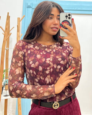 maglia in lycra elasticizzata, scollo a v, dettaglio volant laterale