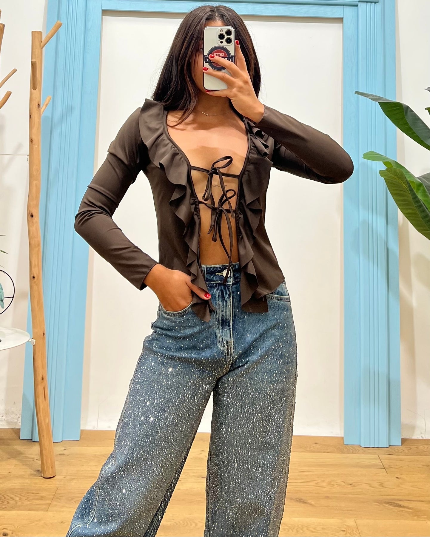 maglia in lycra elasticizzata con scollatura rouge e lacci