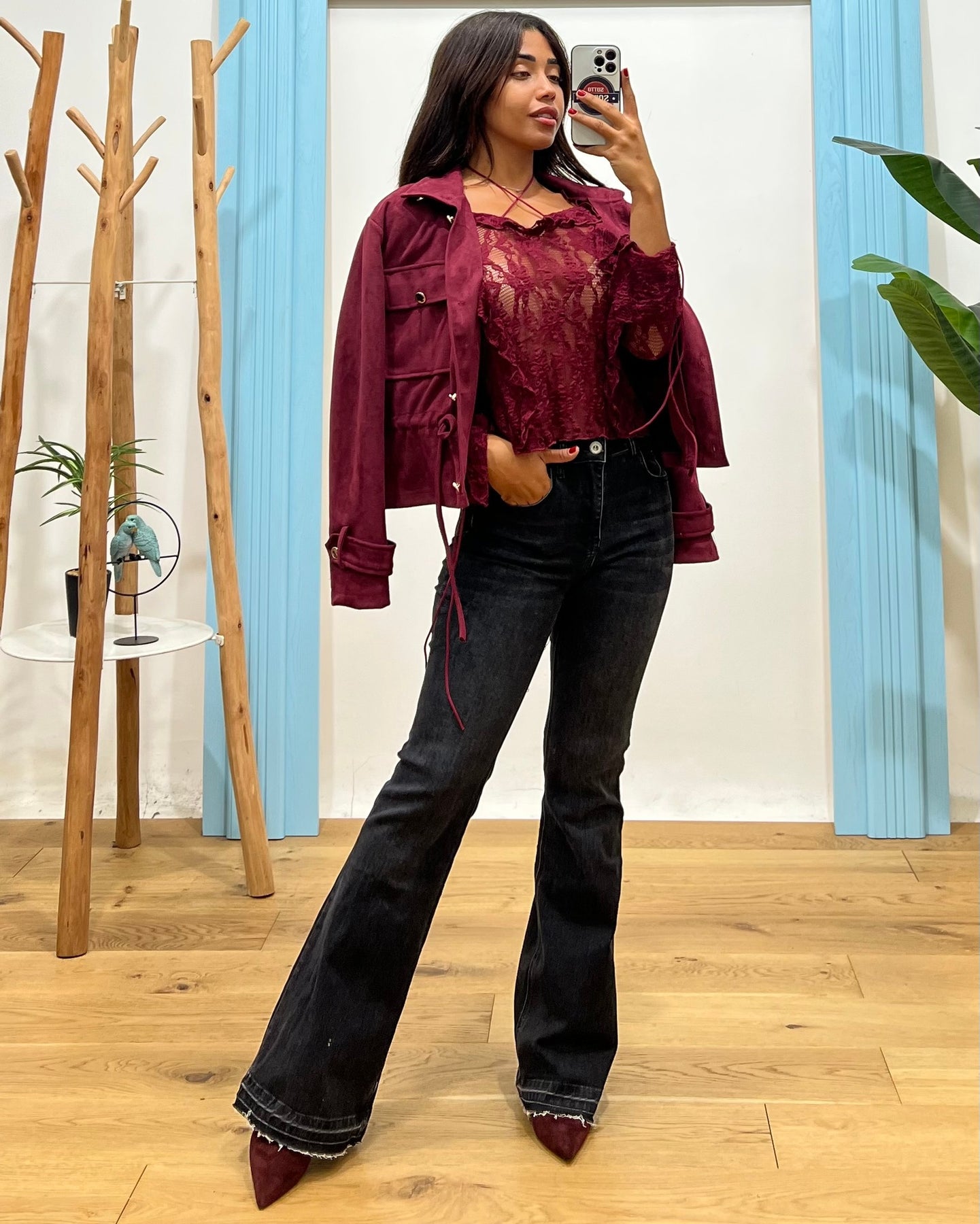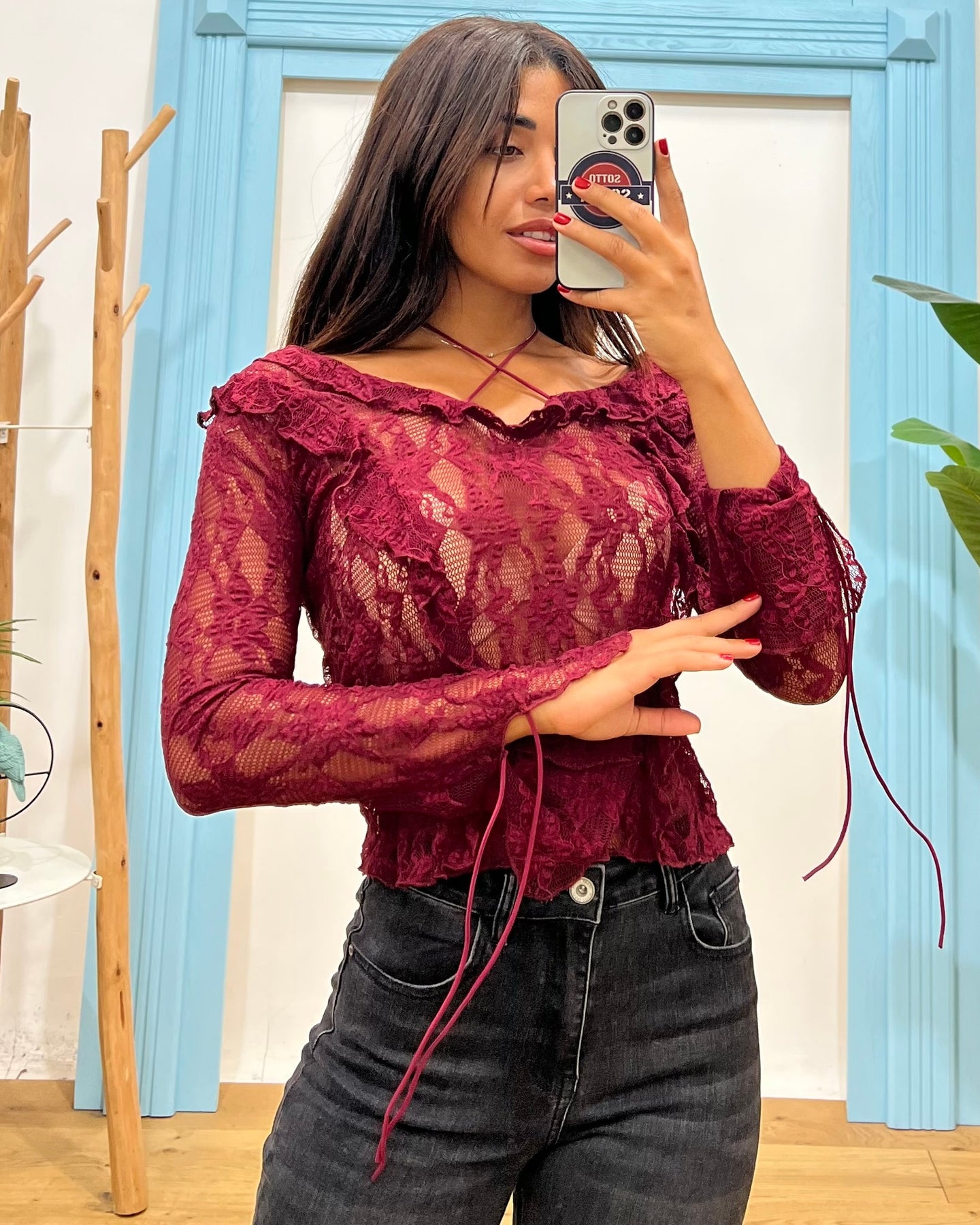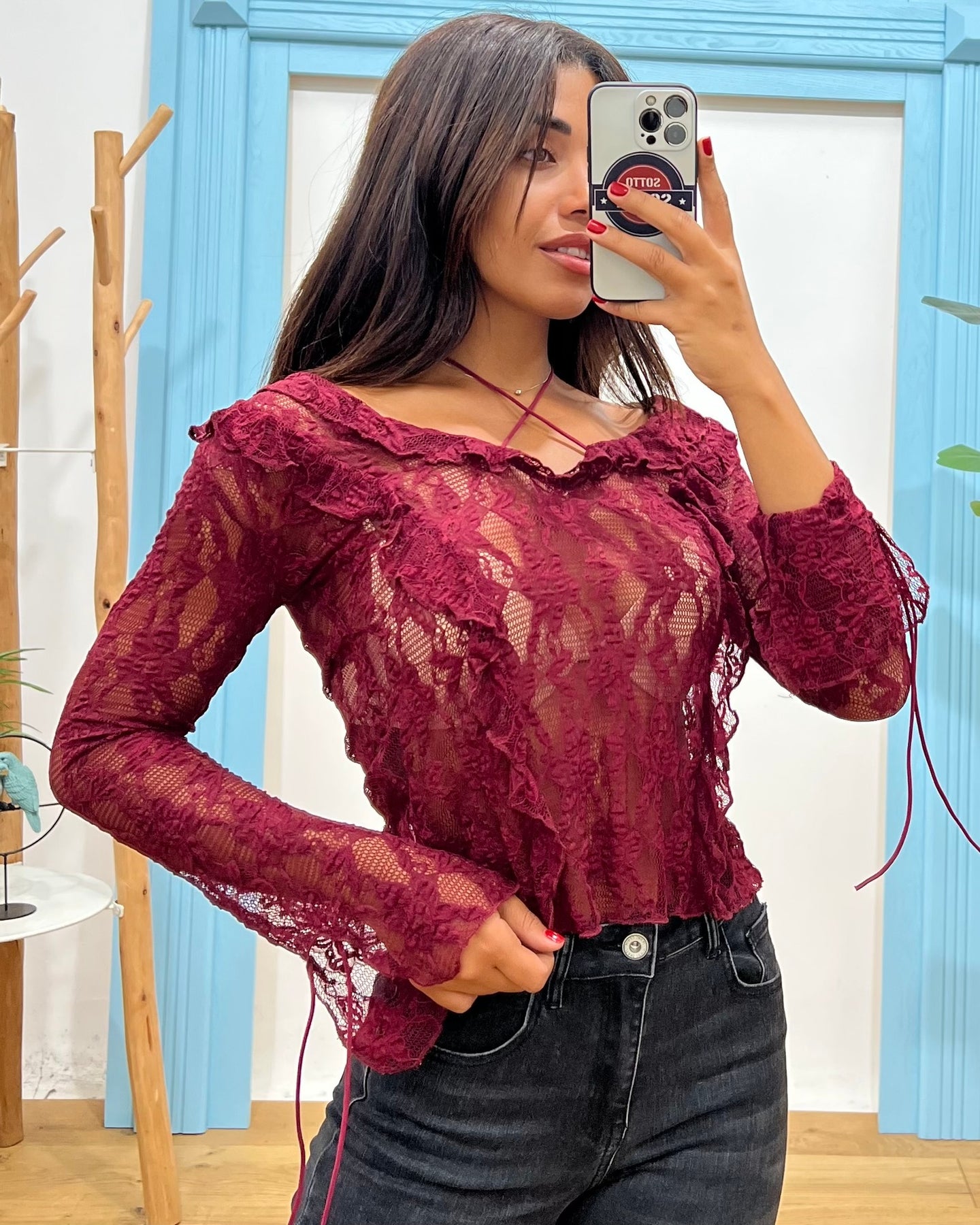 maglia in pizzo con lacci sui polsi e al collo