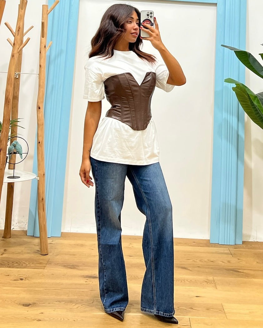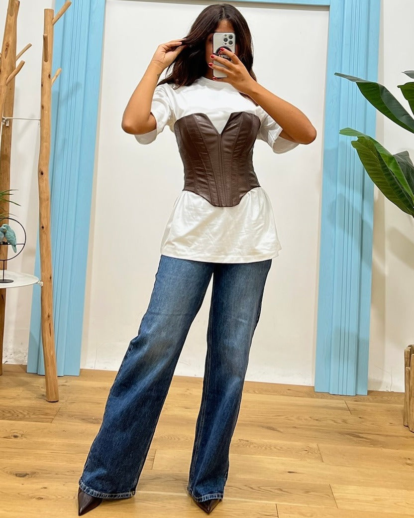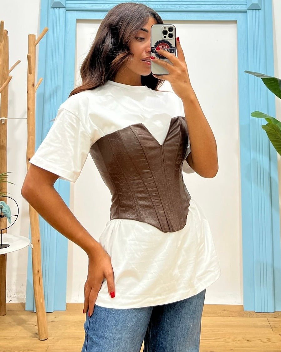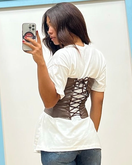 corpetto ecopelle coccodrillato a fascia con scollo a v, elasticizzato con stringhe retro