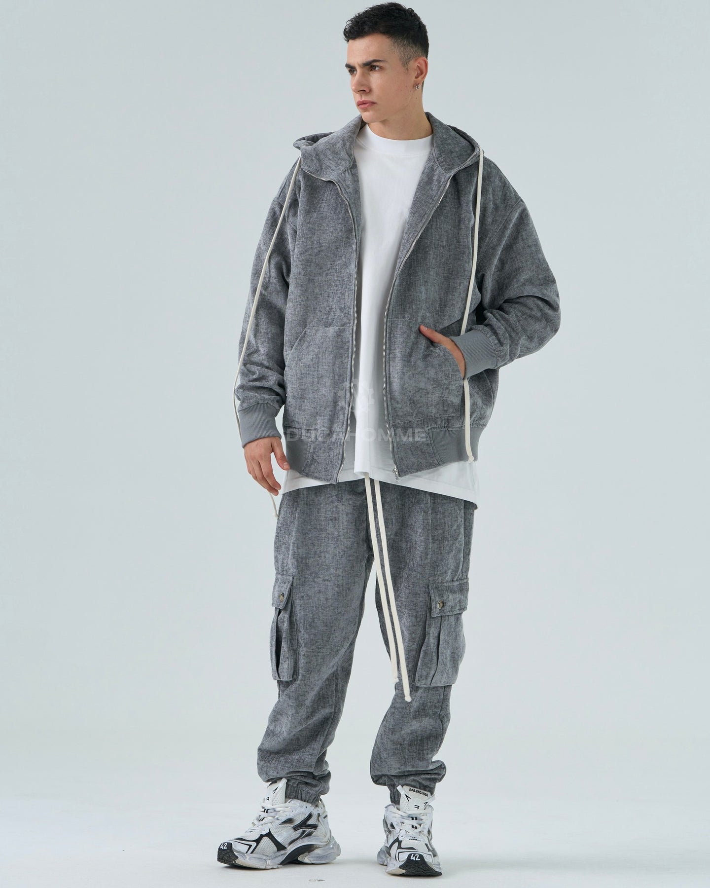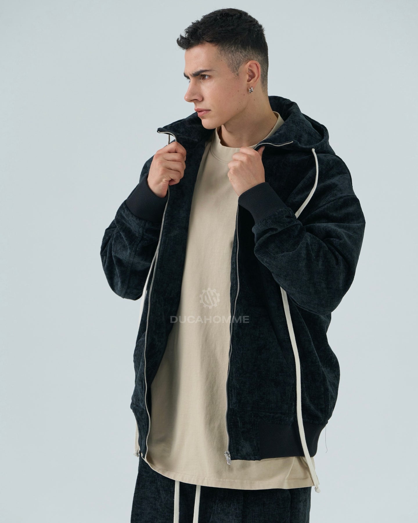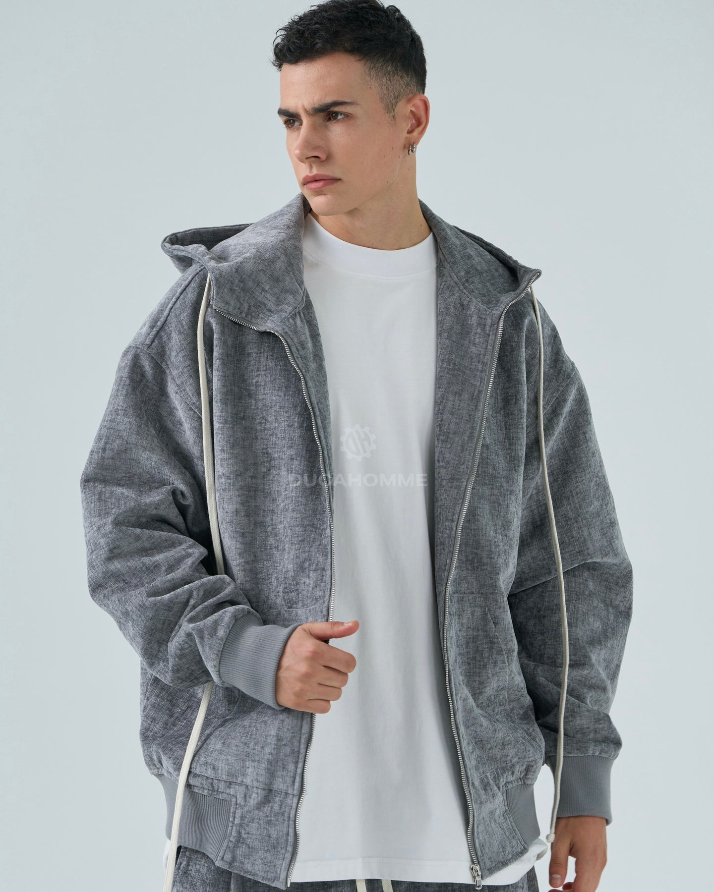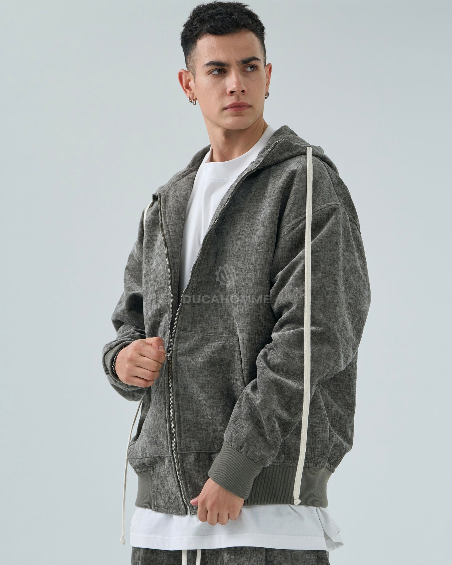 felpa in velluto melange con zip, lacci lunghi e cappuccio