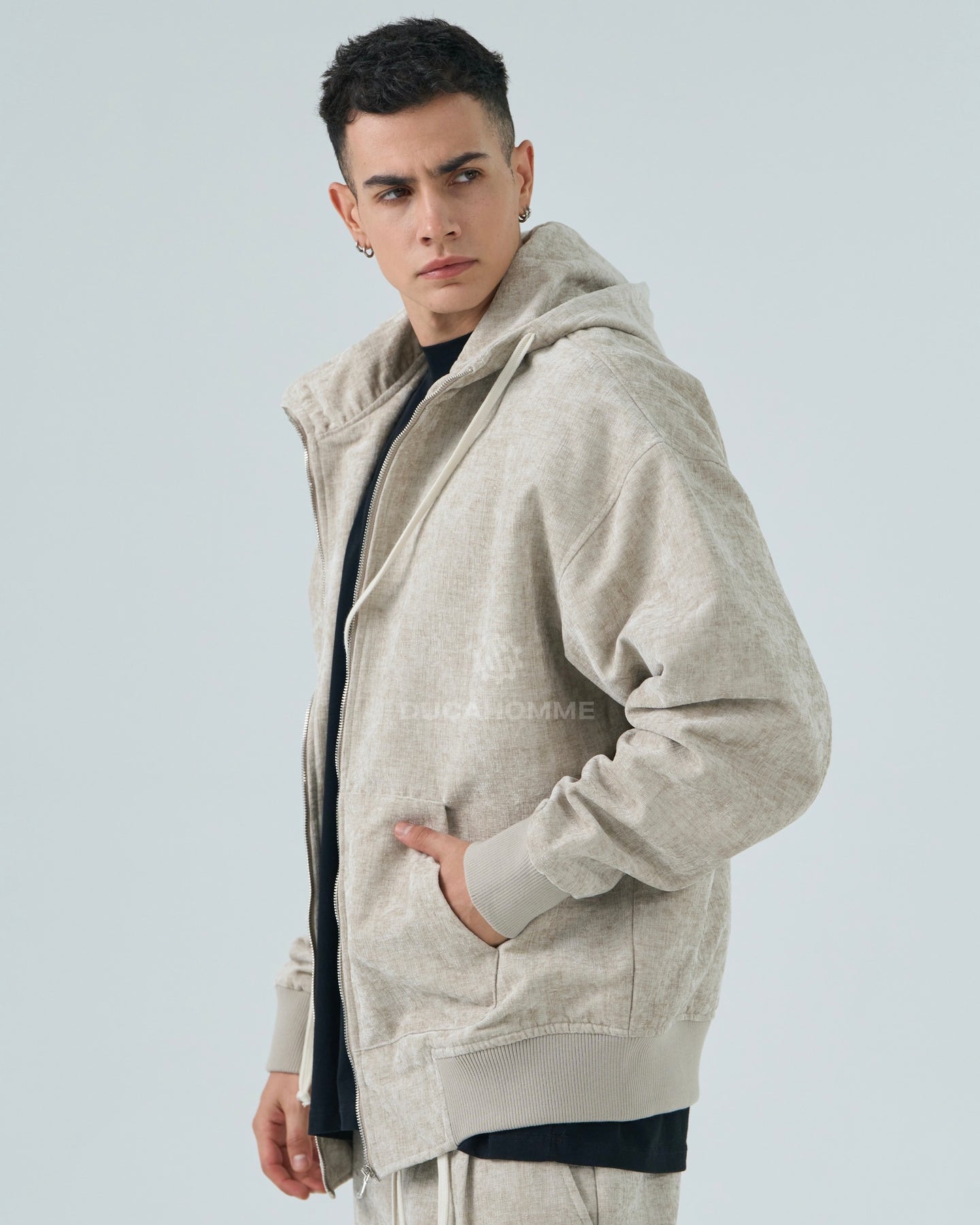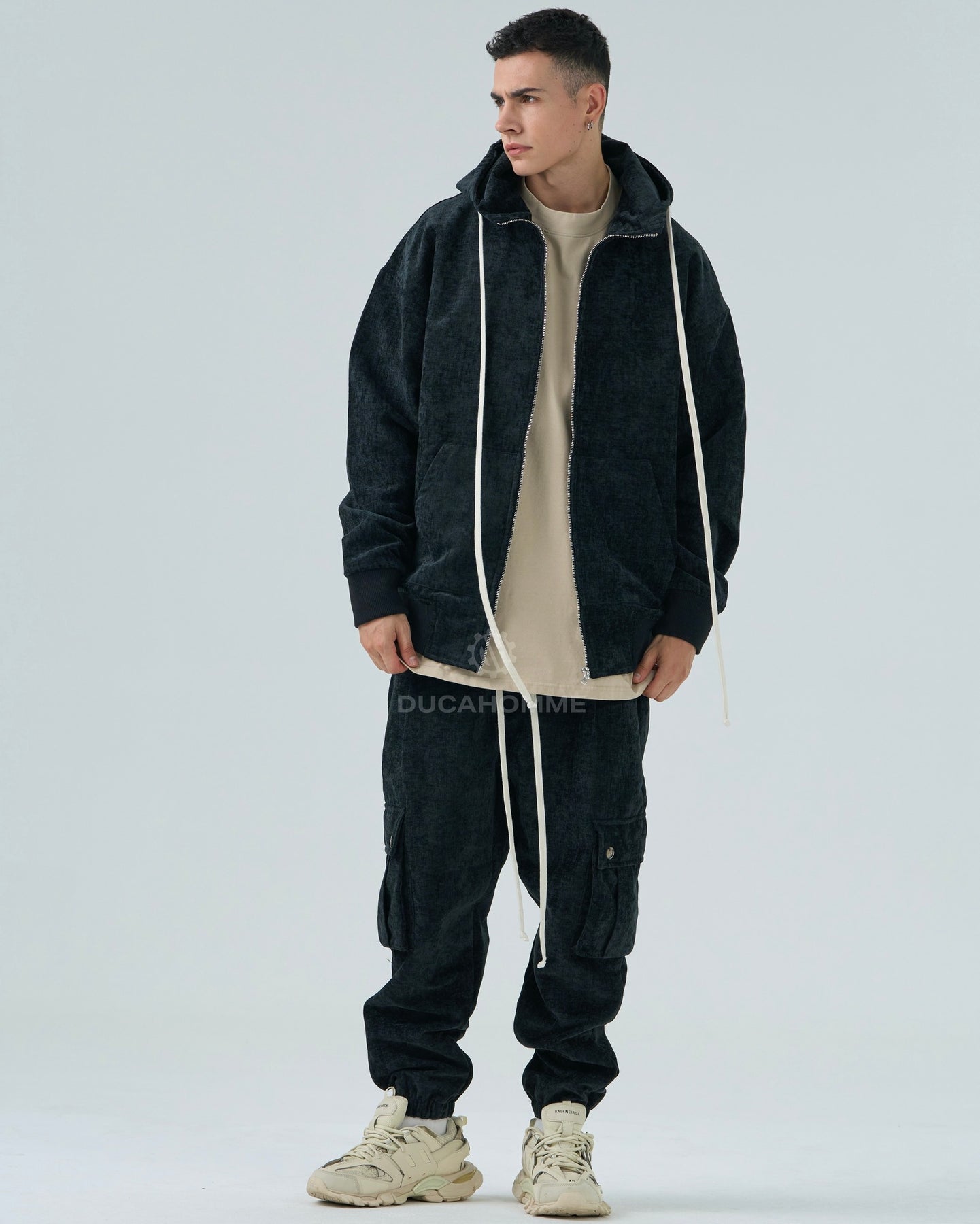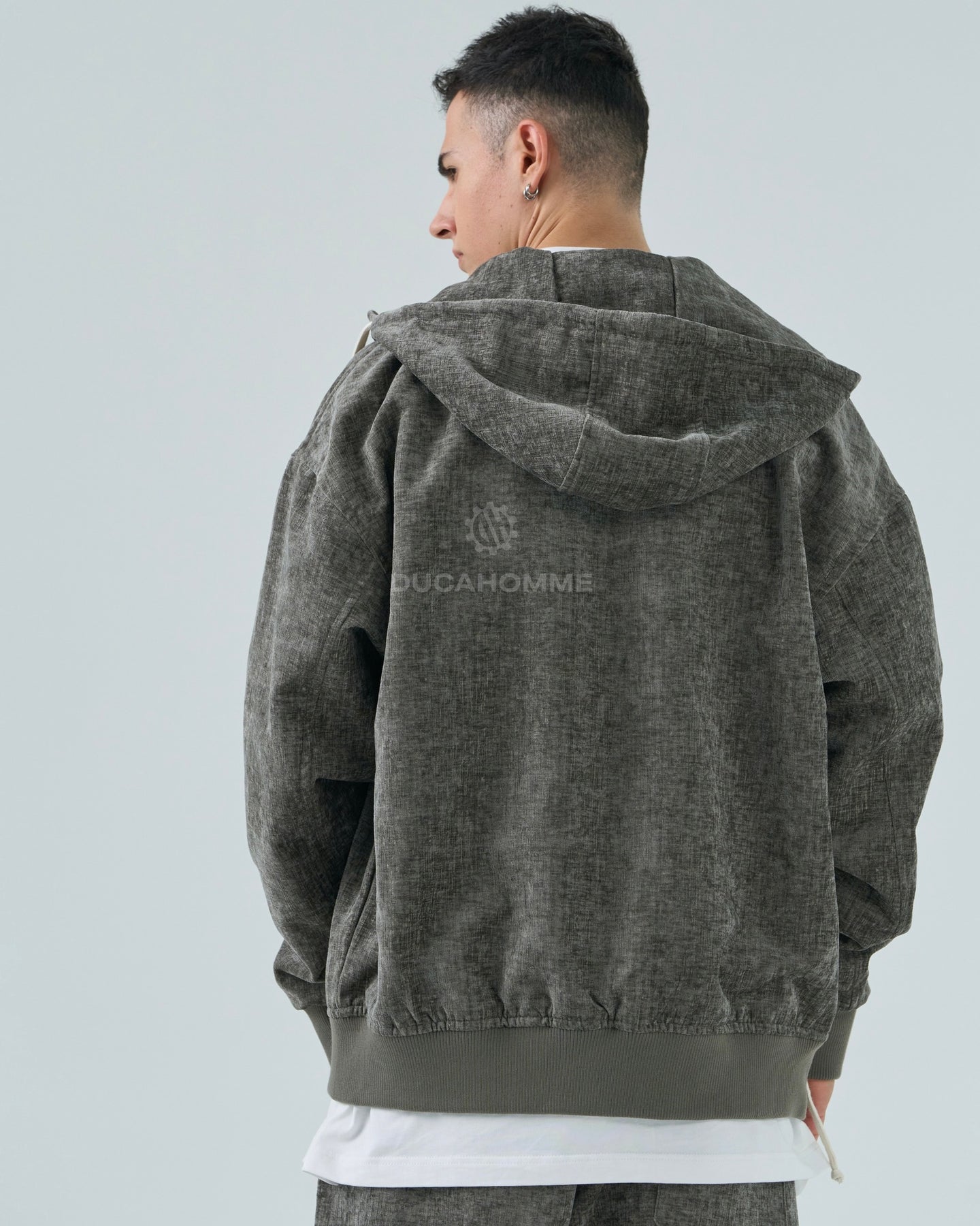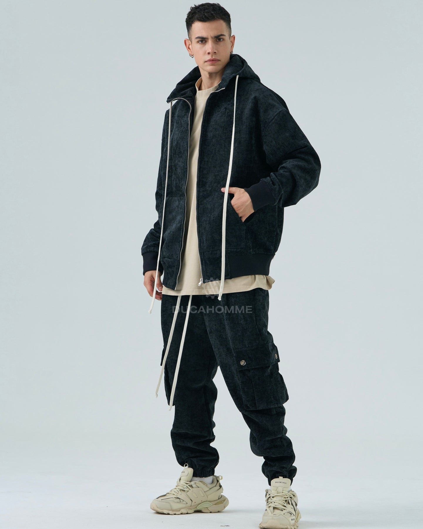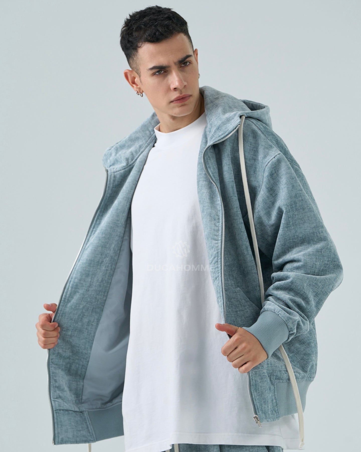 felpa in velluto melange con zip, lacci lunghi e cappuccio