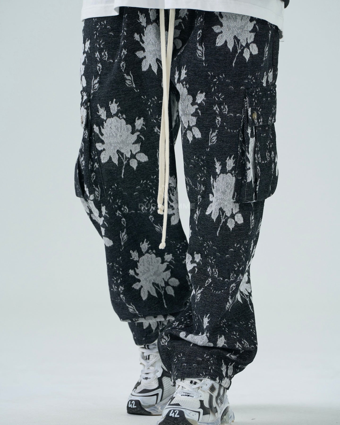pantalone cargo fantasia floreale con elastico in vita e polsini, dettaglio lacci lunghi