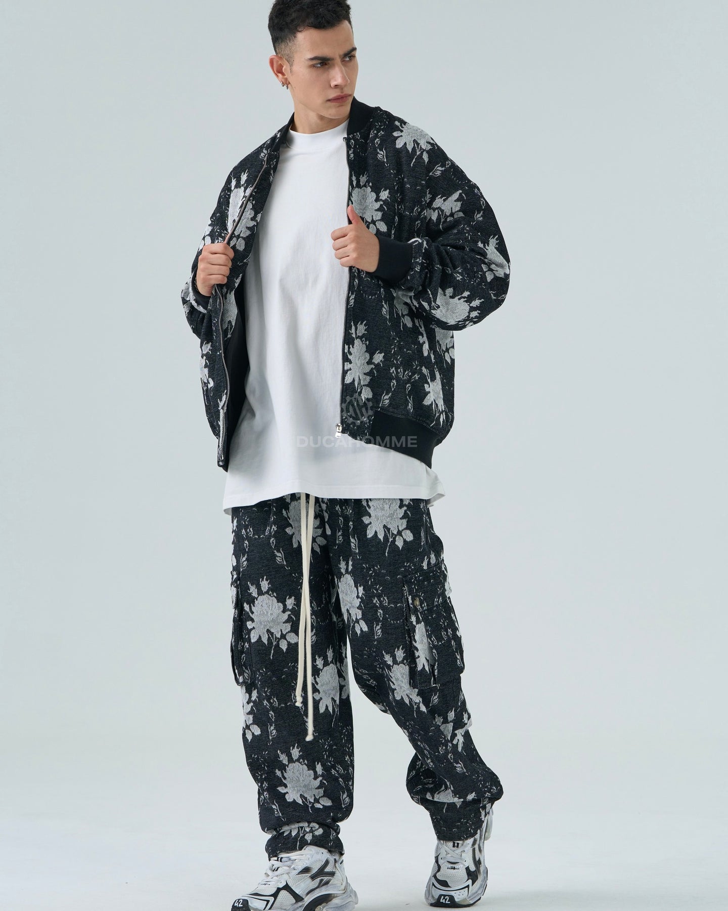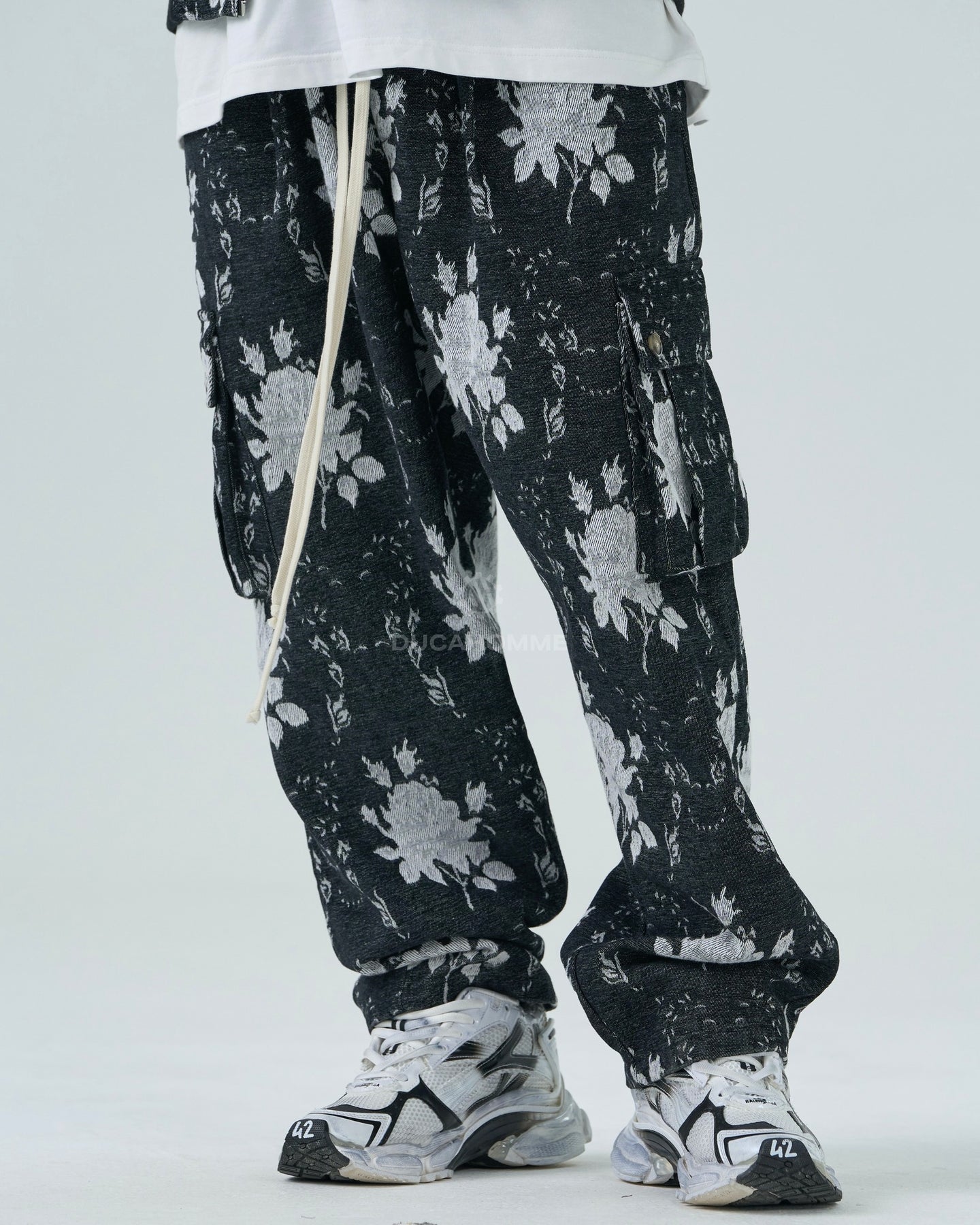 pantalone cargo fantasia floreale con elastico in vita e polsini, dettaglio lacci lunghi