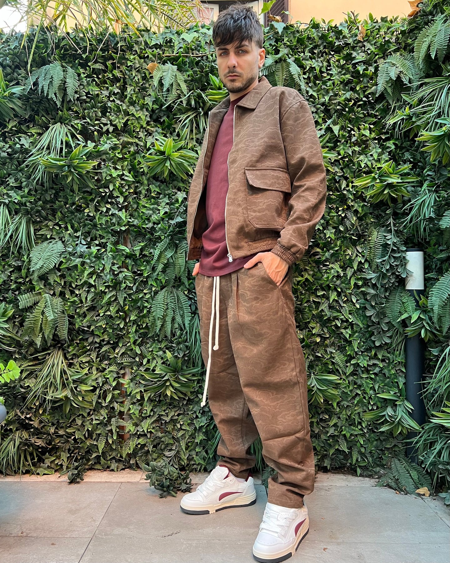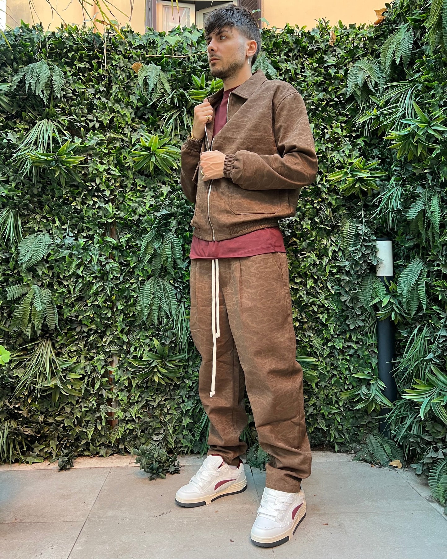 coordinato giacchetto con colletto trama lavorata chiusura zip tasche anteriori, pantalone baggy elastico in vita