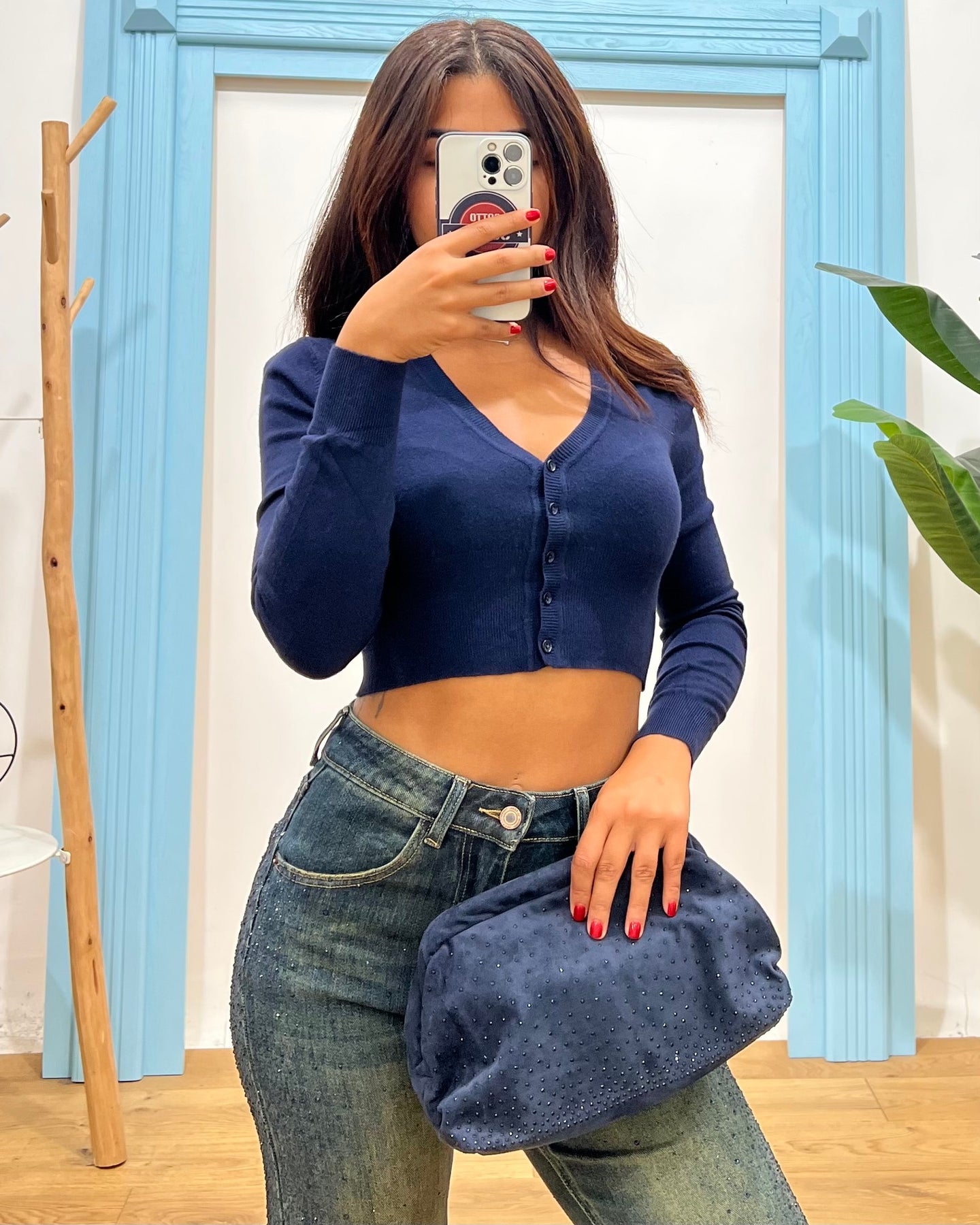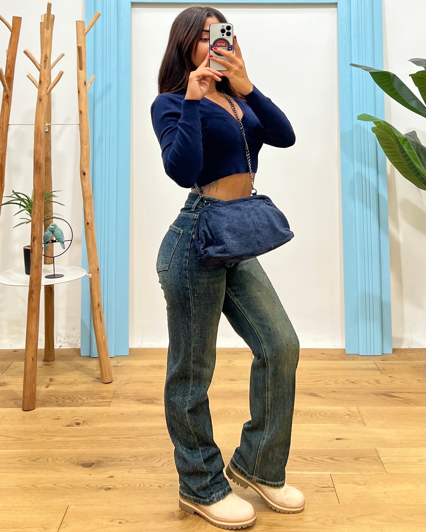 borsa clutch scamosciata con strass, dettaglio tracolla catena