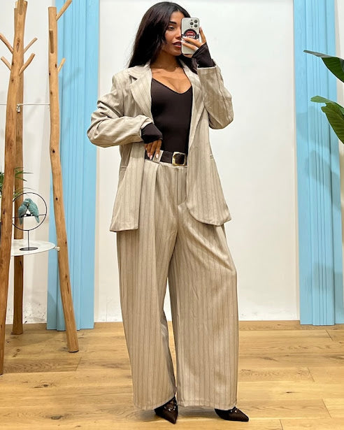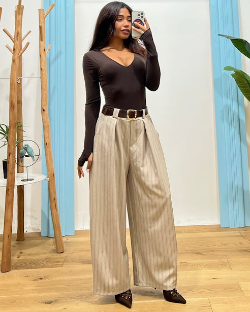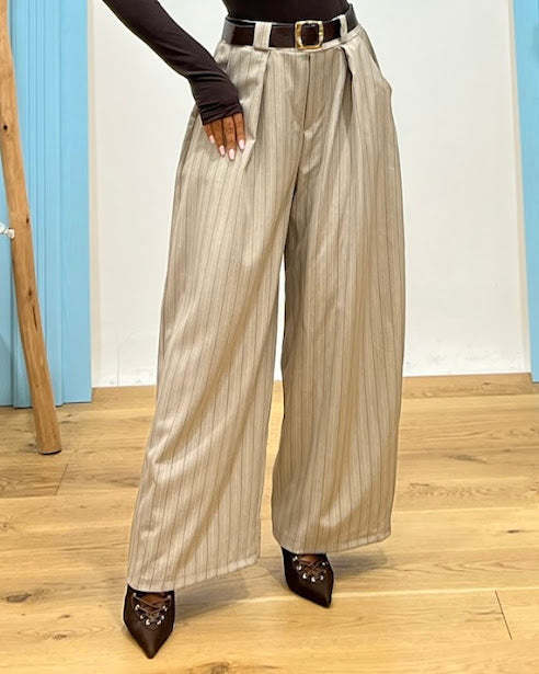 pantalone gessato a palazzo con pence dettaglio vita elastico retro passanti con cintura regolabile