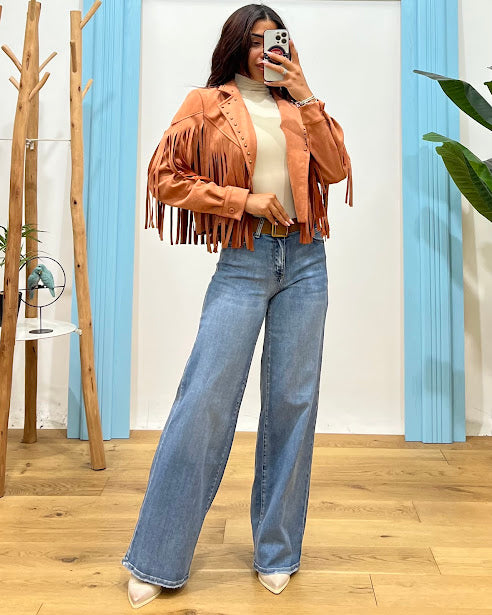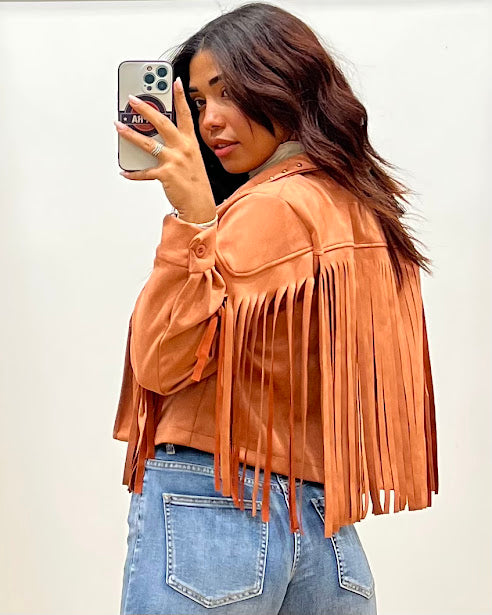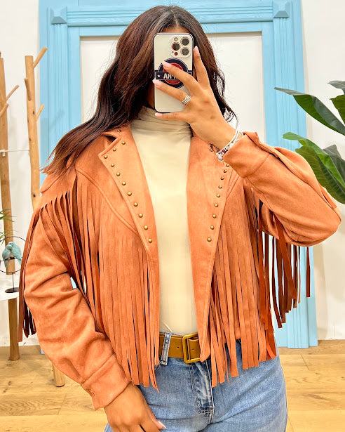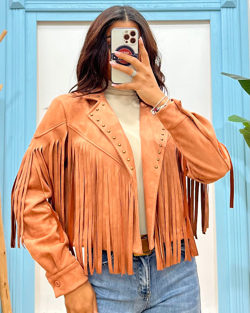 giubbino effetto scamosciato con frange e borchie sul colletto