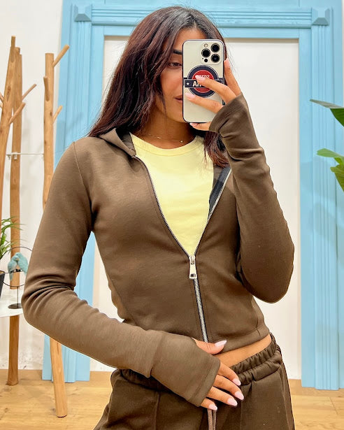 felpa zip tinta unita elasticizzata con cappuccio