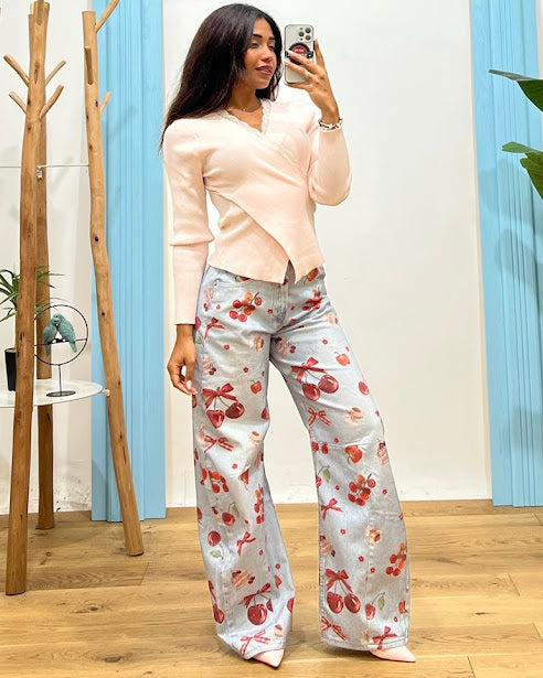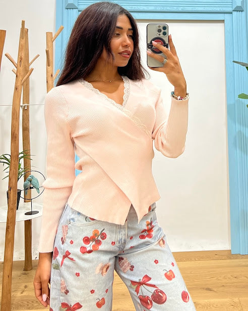 maglia in tessuto a costine incrociata, dettaglio scollo a v con bordo in pizzo