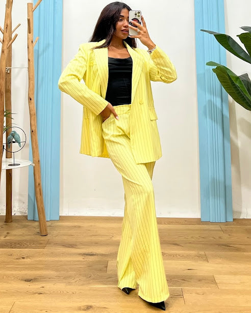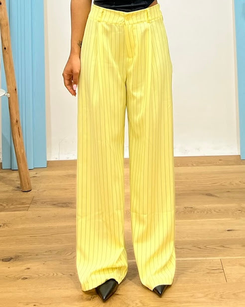 pantalone palazzo gessato vita con chiusura bottone ed elastico retro