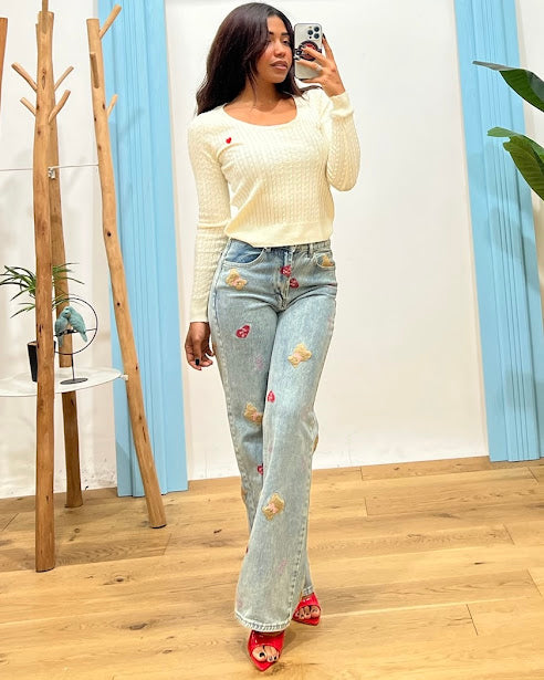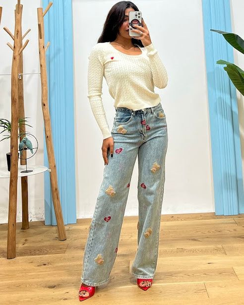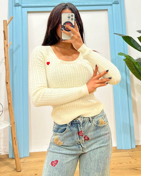 maglia in filo lavorato con trecce, dettaglio cuoricino