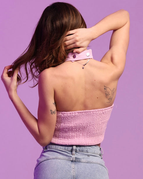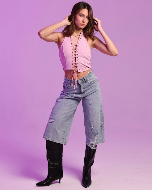 top stringato con laccio al collo e fascia elasticizzata