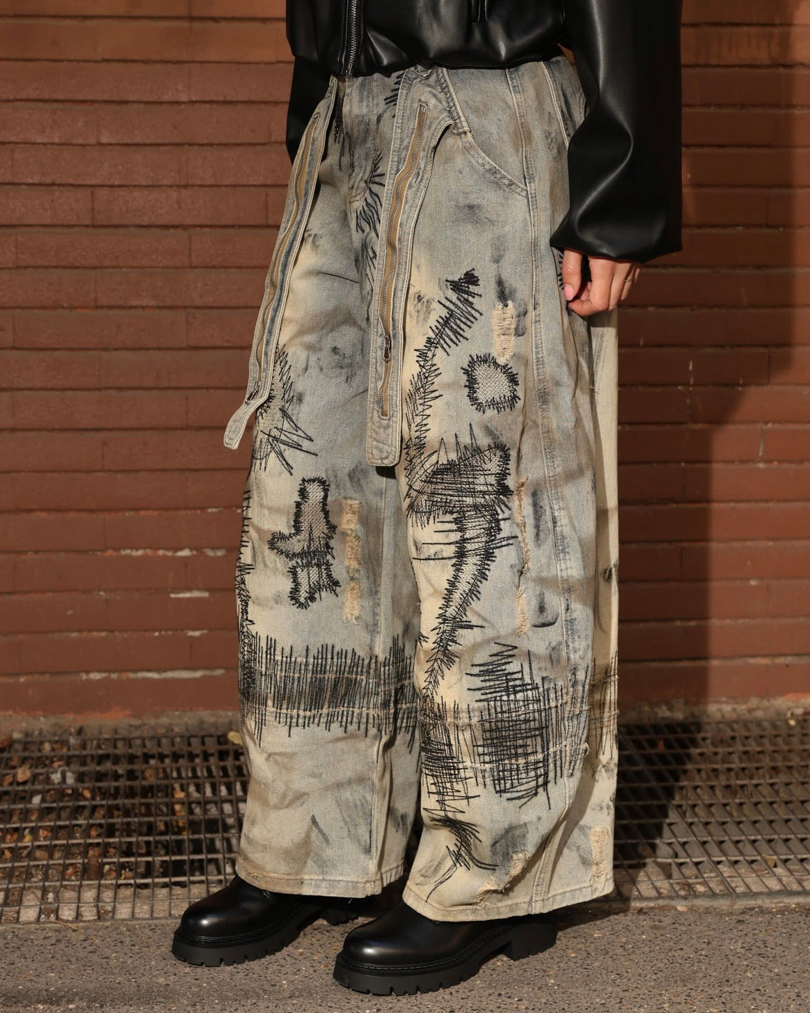 jeans lavorati con cuciture a vista dettaglio inserti cerniere frontali