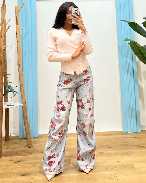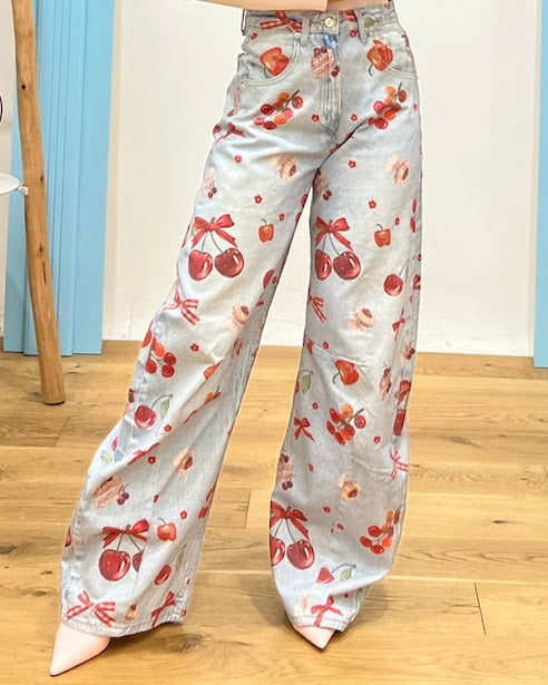 jeans vita alta balloon, lavaggio chiaro con stampe frutta e dolci