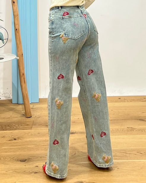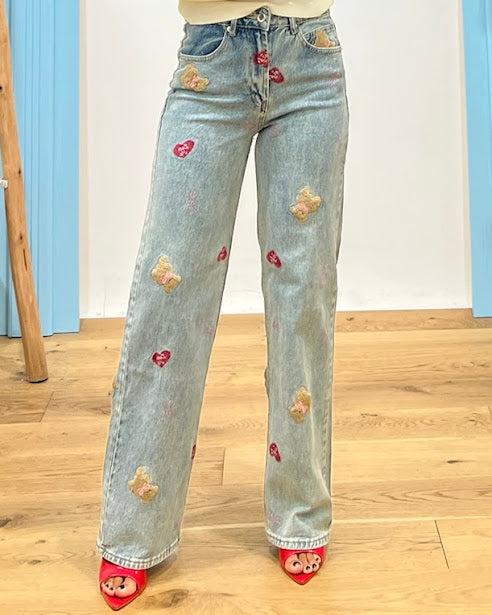 jeans vita alta a palazzo leggermente elasticizzato con orsetti e fiocchi applicati