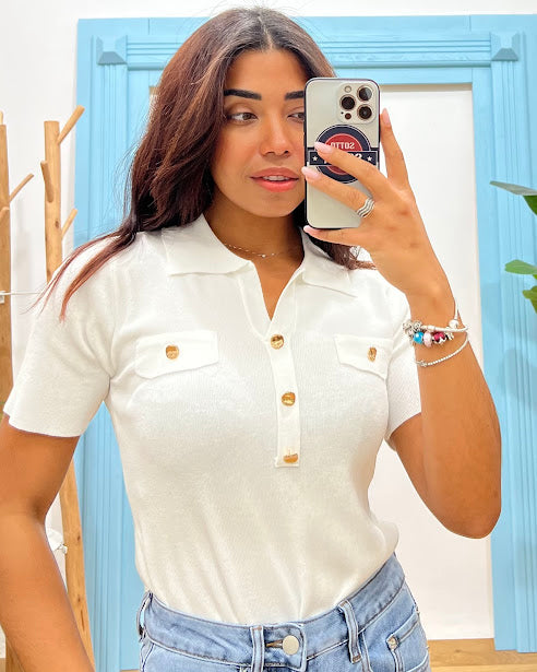 maglia mezza manica con colletto e bottoni dorati, dettaglio finte tasche