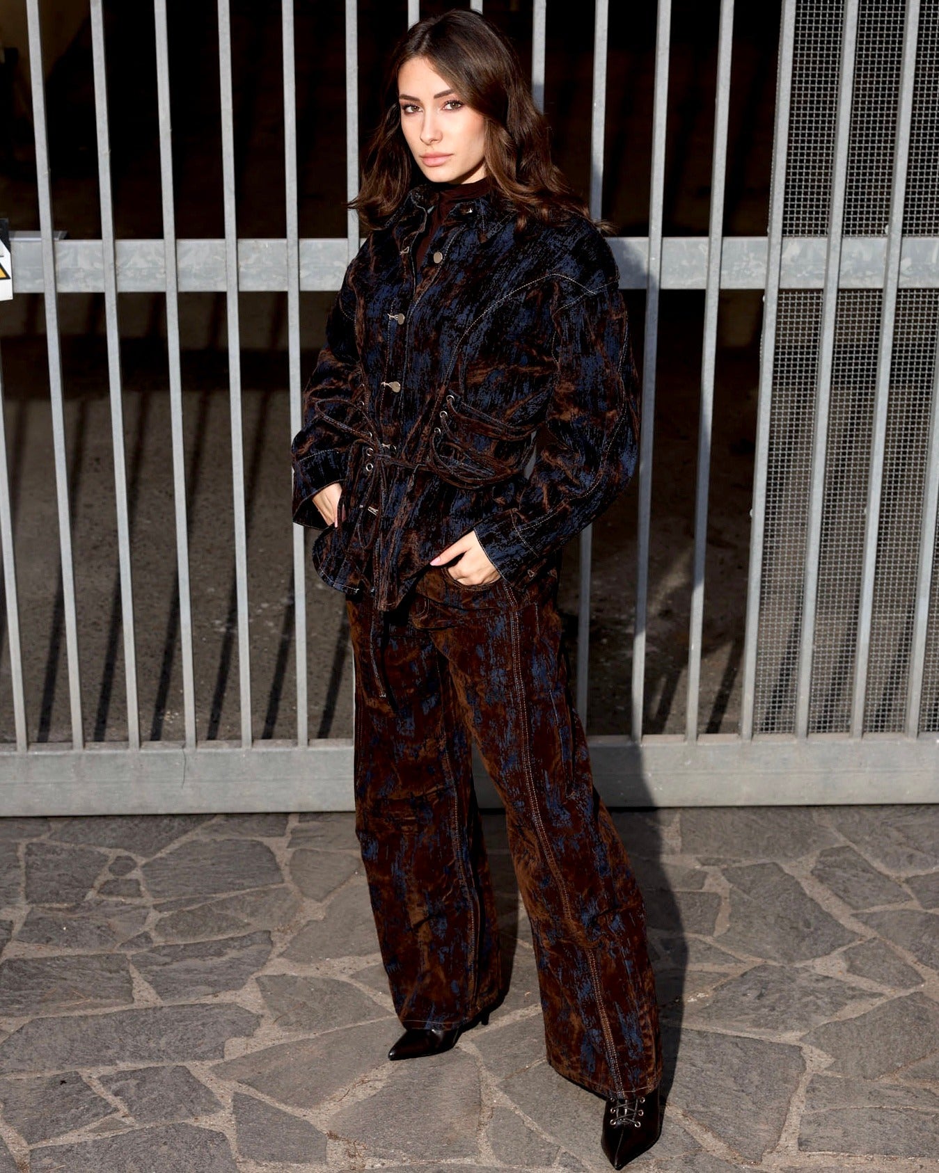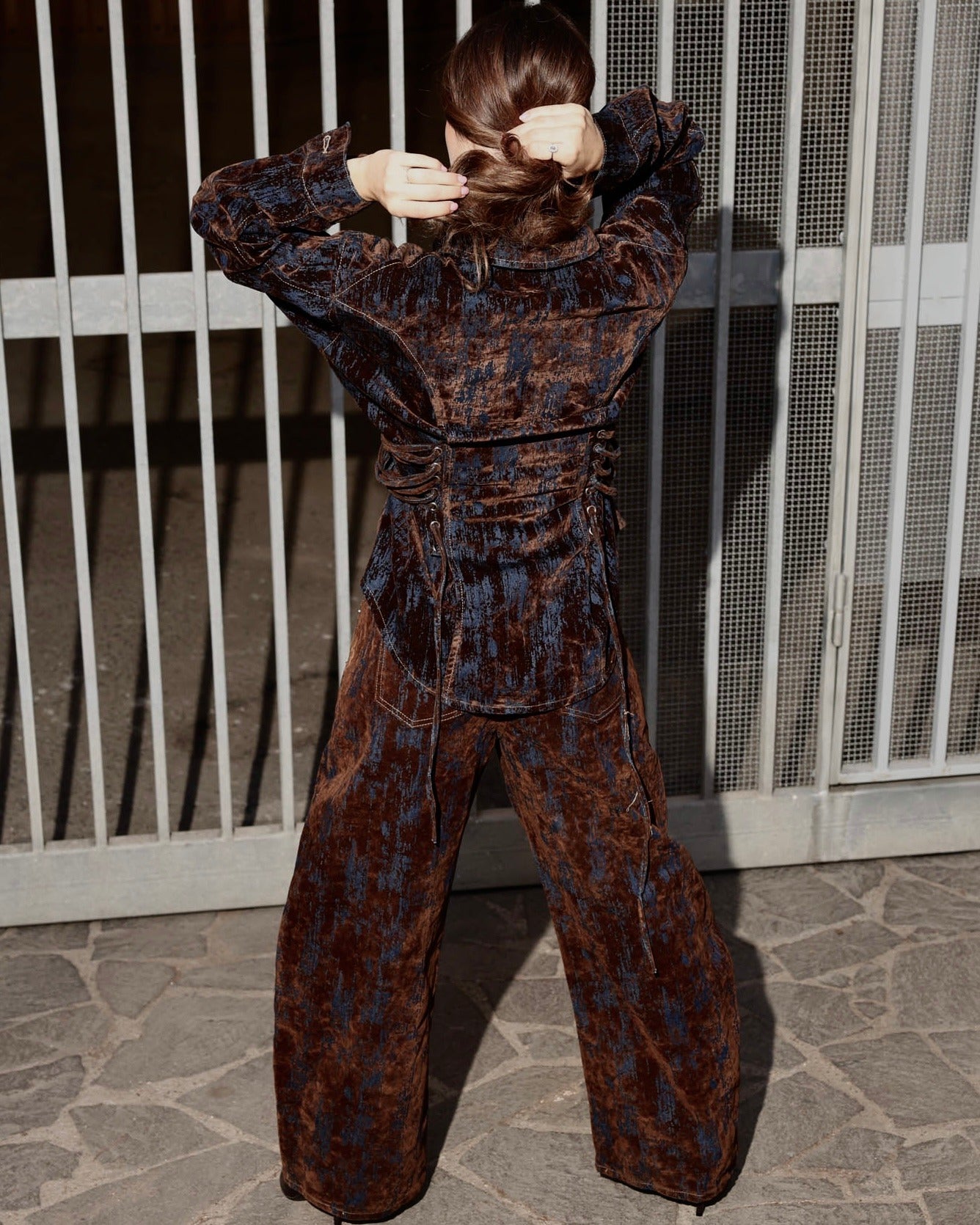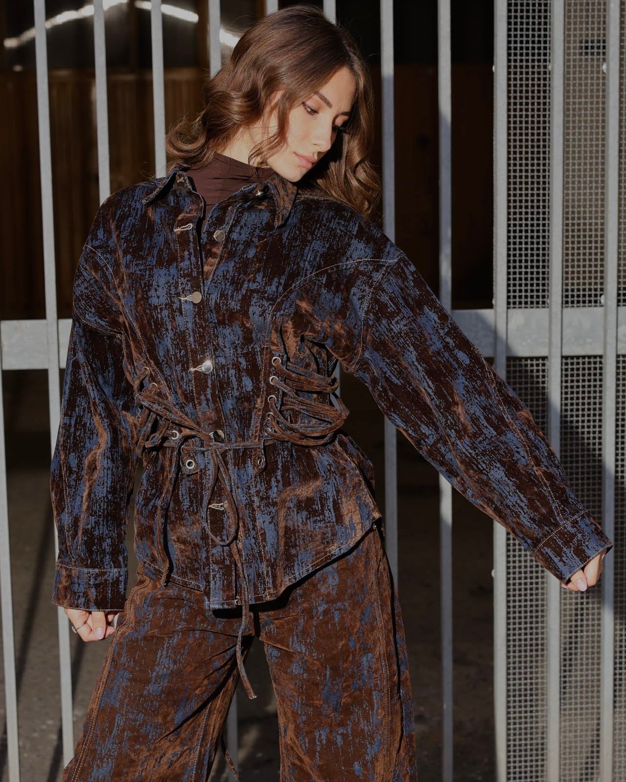 giacca camouflage in denim con inserti in velluto dettaglio laterale stringhe regolabili