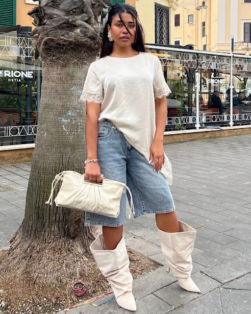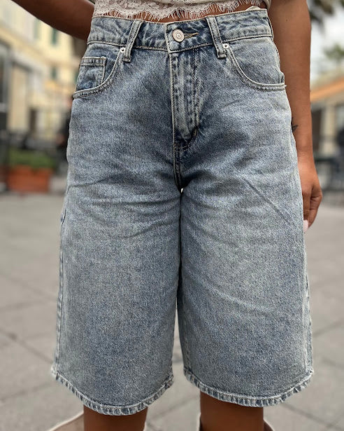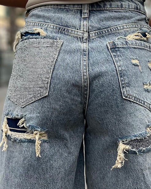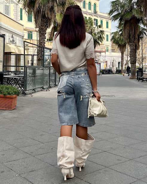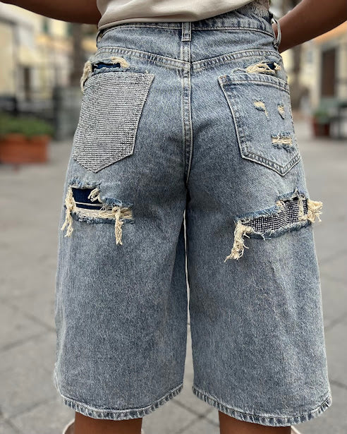 bermuda jeans con tasca anteriore strass e strappi retro